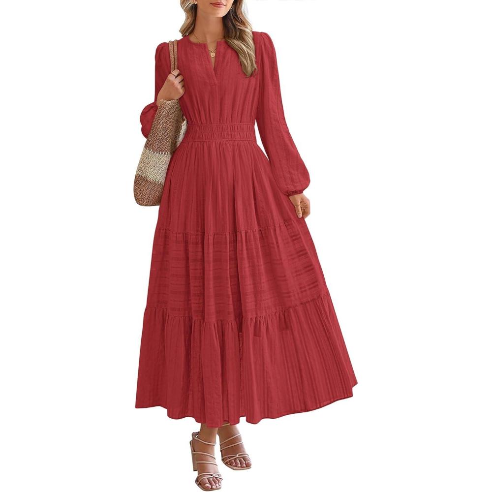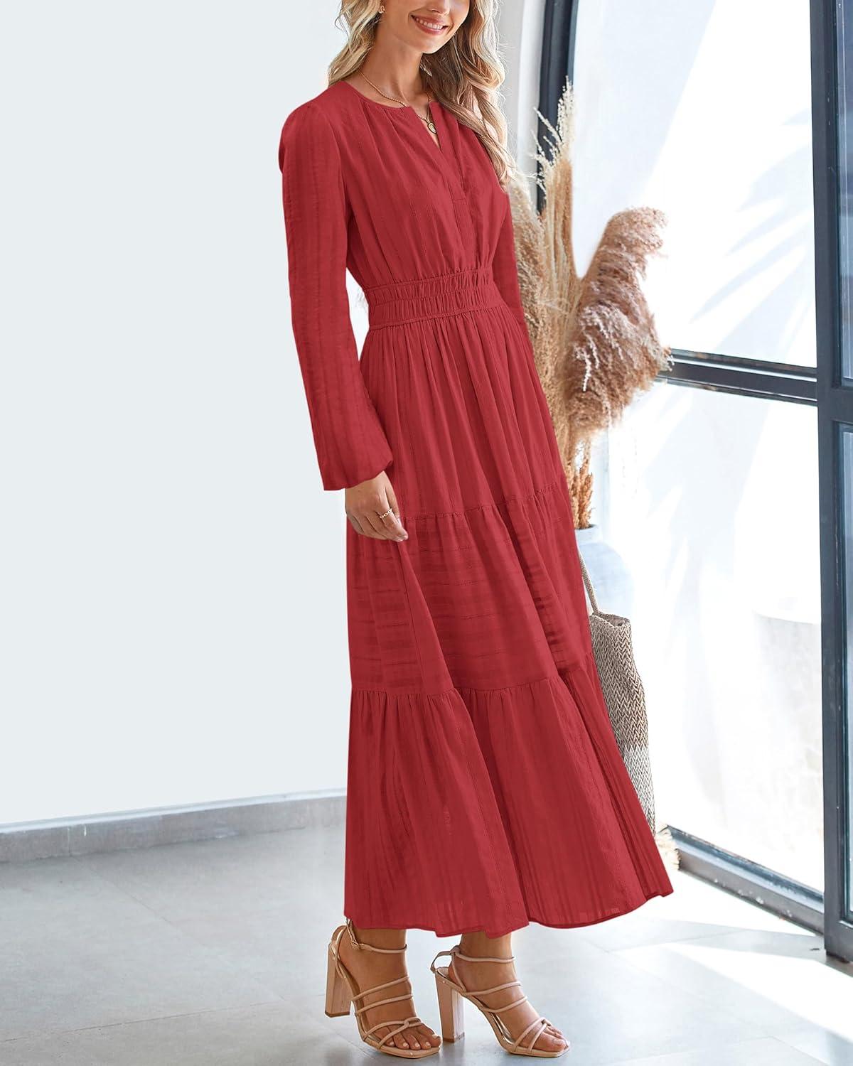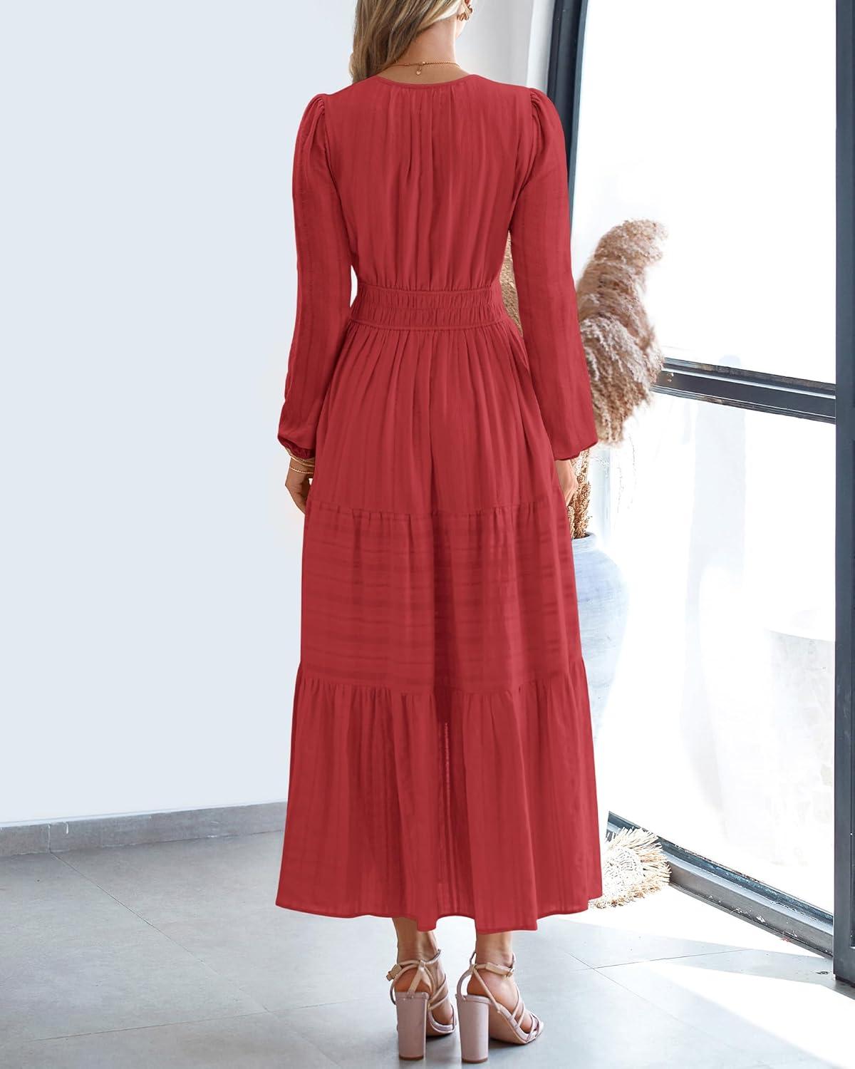 BTFBM Spring Dresses for Women 2026 Casual Long Sleeve V Neck Elastic Waist Lightweight Maxi Wedding Guest Dress Pockets(Red)