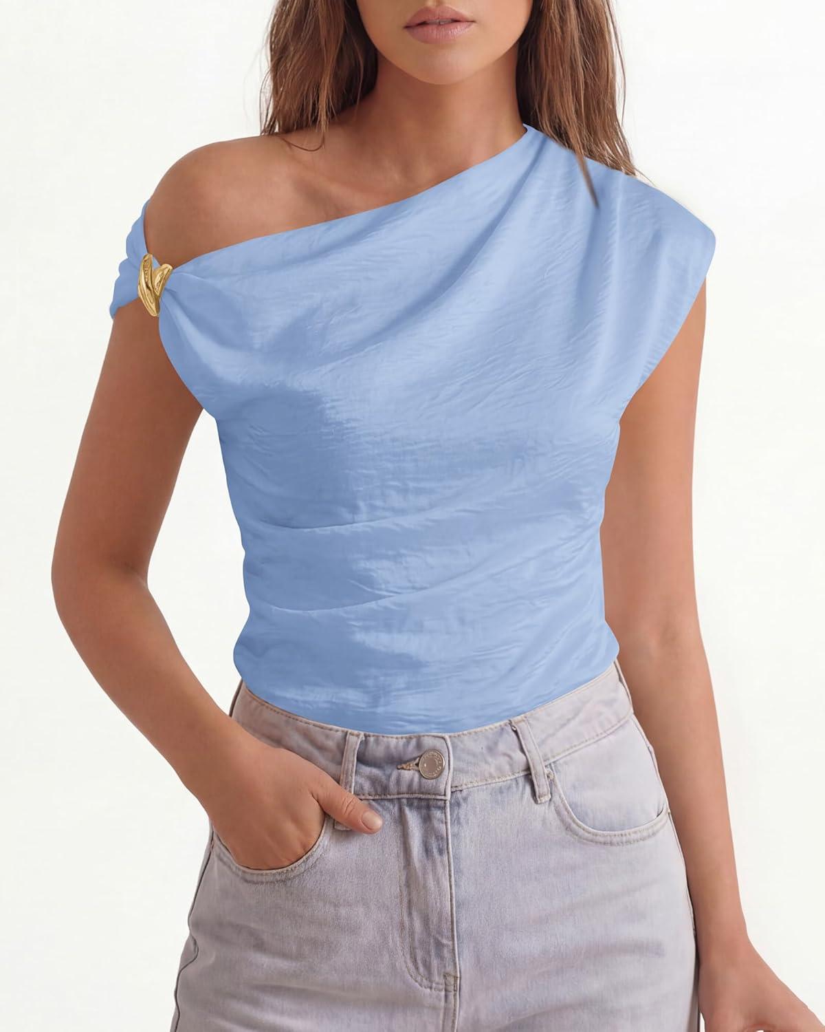 BTFBM Spring Tops for Women Trendy Off The Shoulder Top Sleeveless Ruched Going Out Solid Tank Blouses Fashion Clothing(Light Blue)