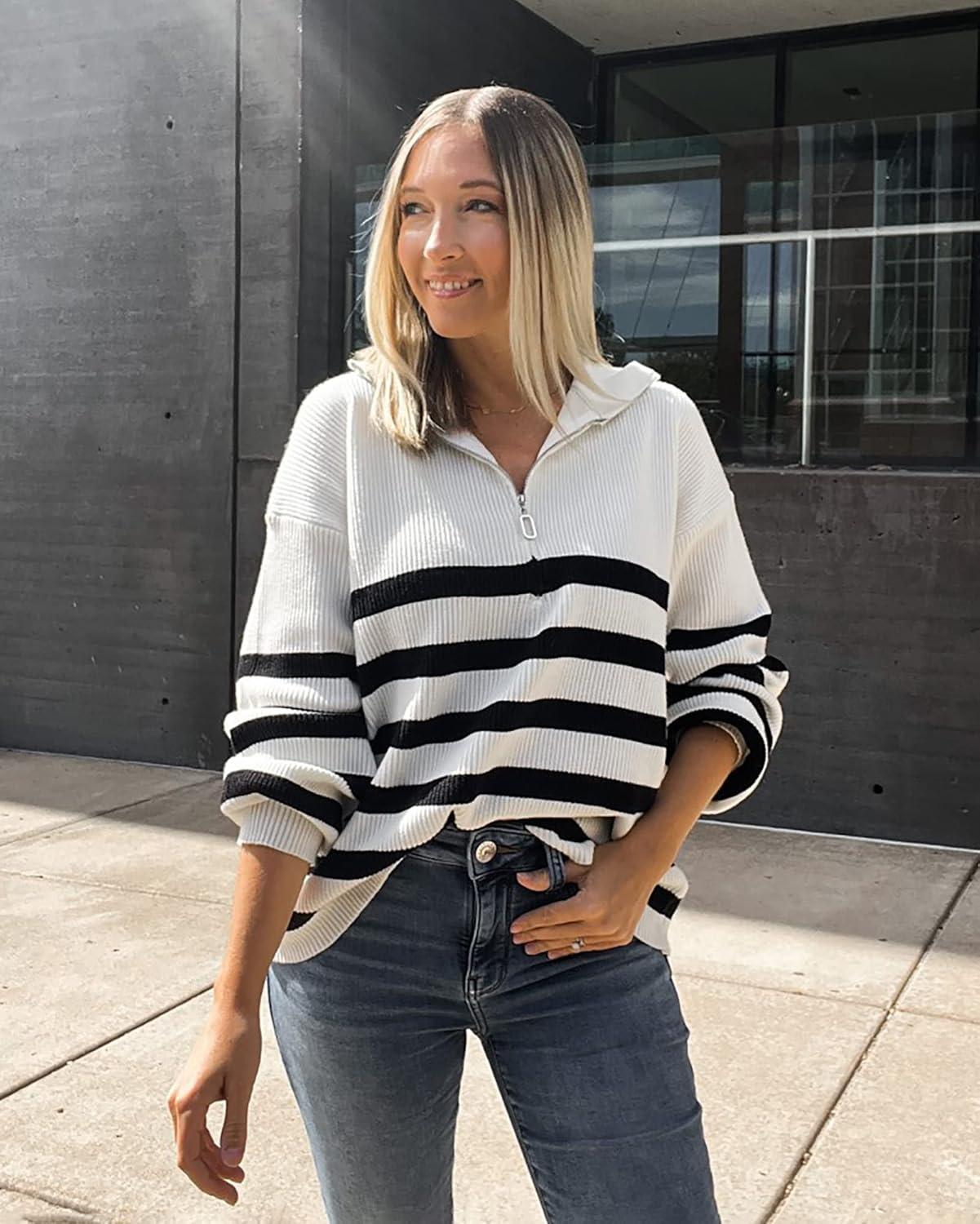 BTFBM Striped Quarter Zip Sweater Women Fall Outfits Winter Clothing V Neck Long Sleeve Knit Collared Sweaters Pullover(Striped Black)