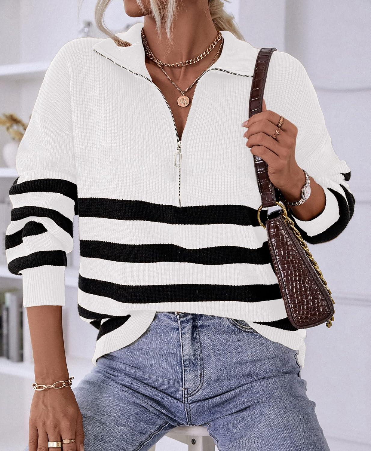 BTFBM Striped Quarter Zip Sweater Women Fall Outfits Winter Clothing V Neck Long Sleeve Knit Collared Sweaters Pullover(Striped White)
