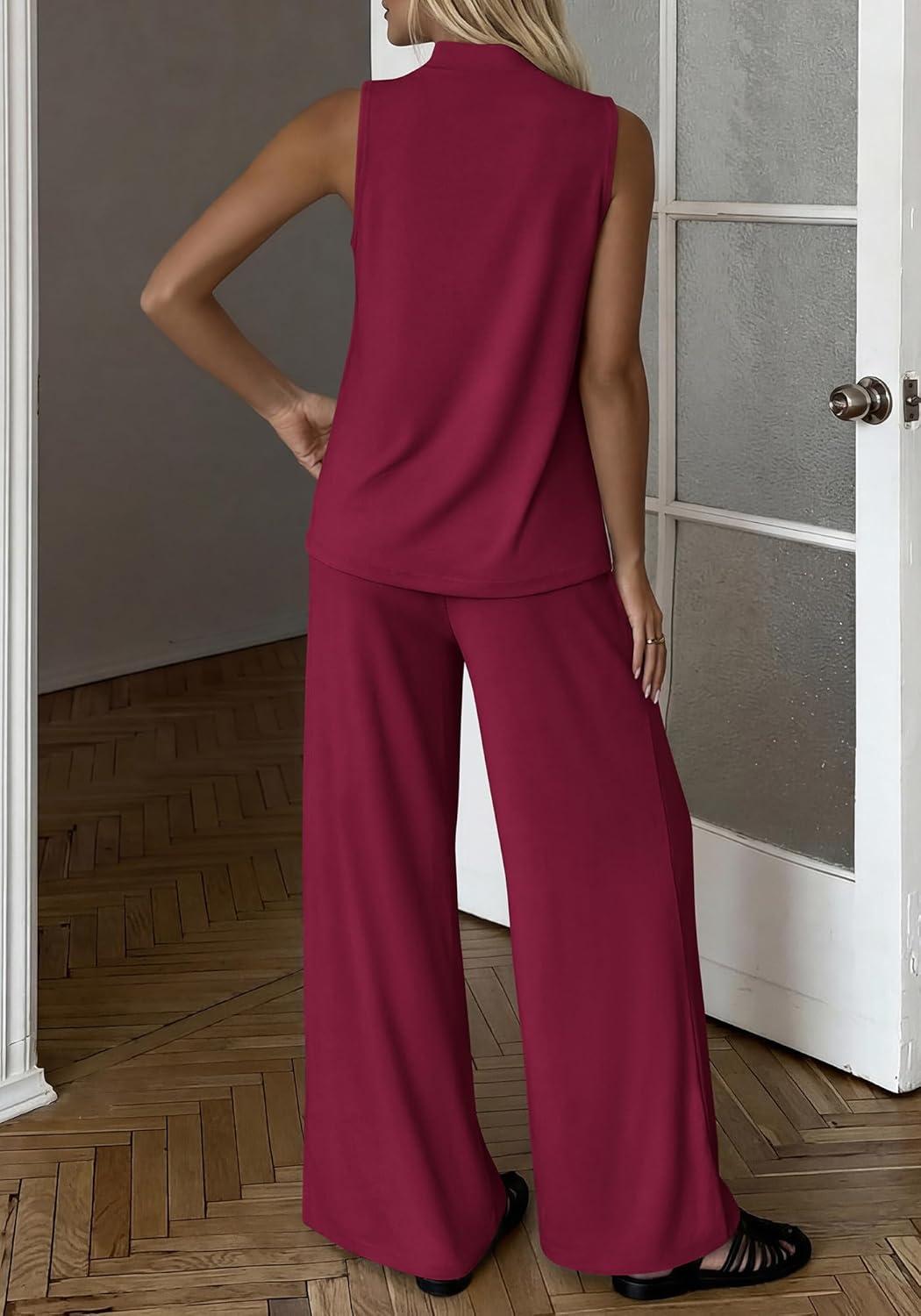 BTFBM Summer 2 Piece Lounge Sets For Women Sleeveless Mock Neck Top Wide Leg Pants Airport Travel Beach Vacation Outfits(Burgundy)