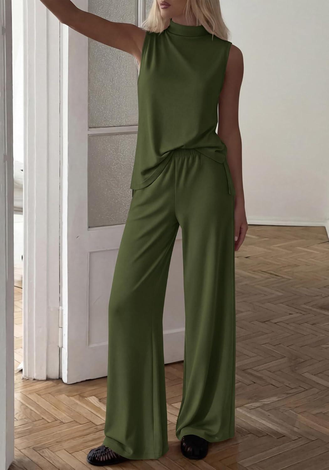 BTFBM Summer 2 Piece Lounge Sets For Women Sleeveless Mock Neck Top Wide Leg Pants Spring Vacation Airport Travel Outfits(Army Green)
