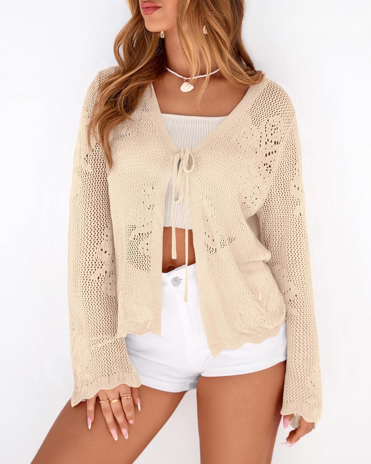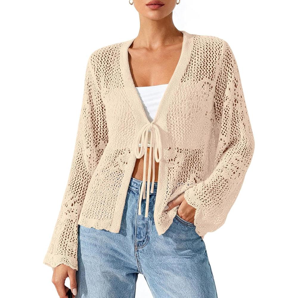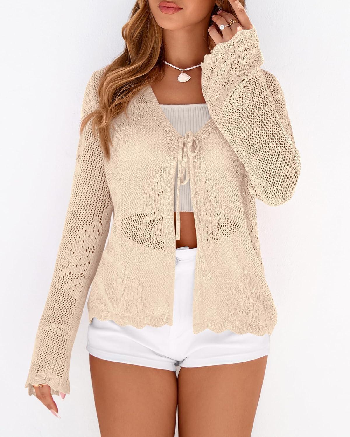 BTFBM Summer Cardigans for Women Lightweight 2026 Spring Crochet Mesh Long Sleeve Tie Front Knit Beach Vacation Outfits(Apricot)