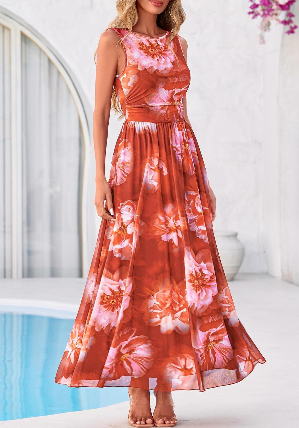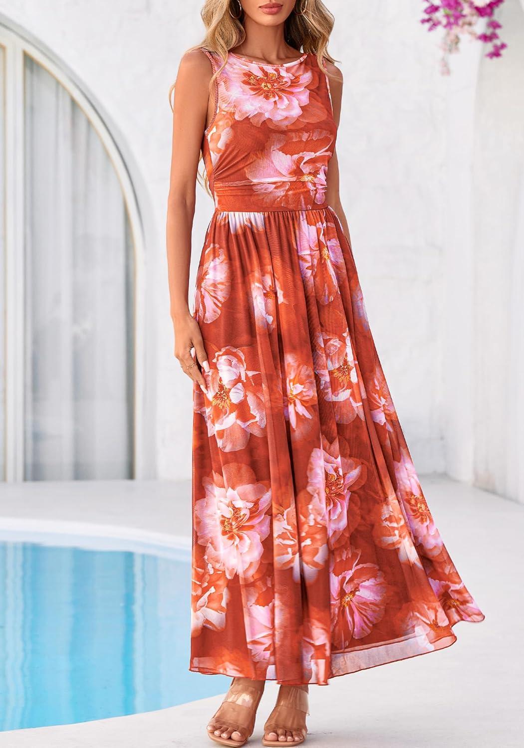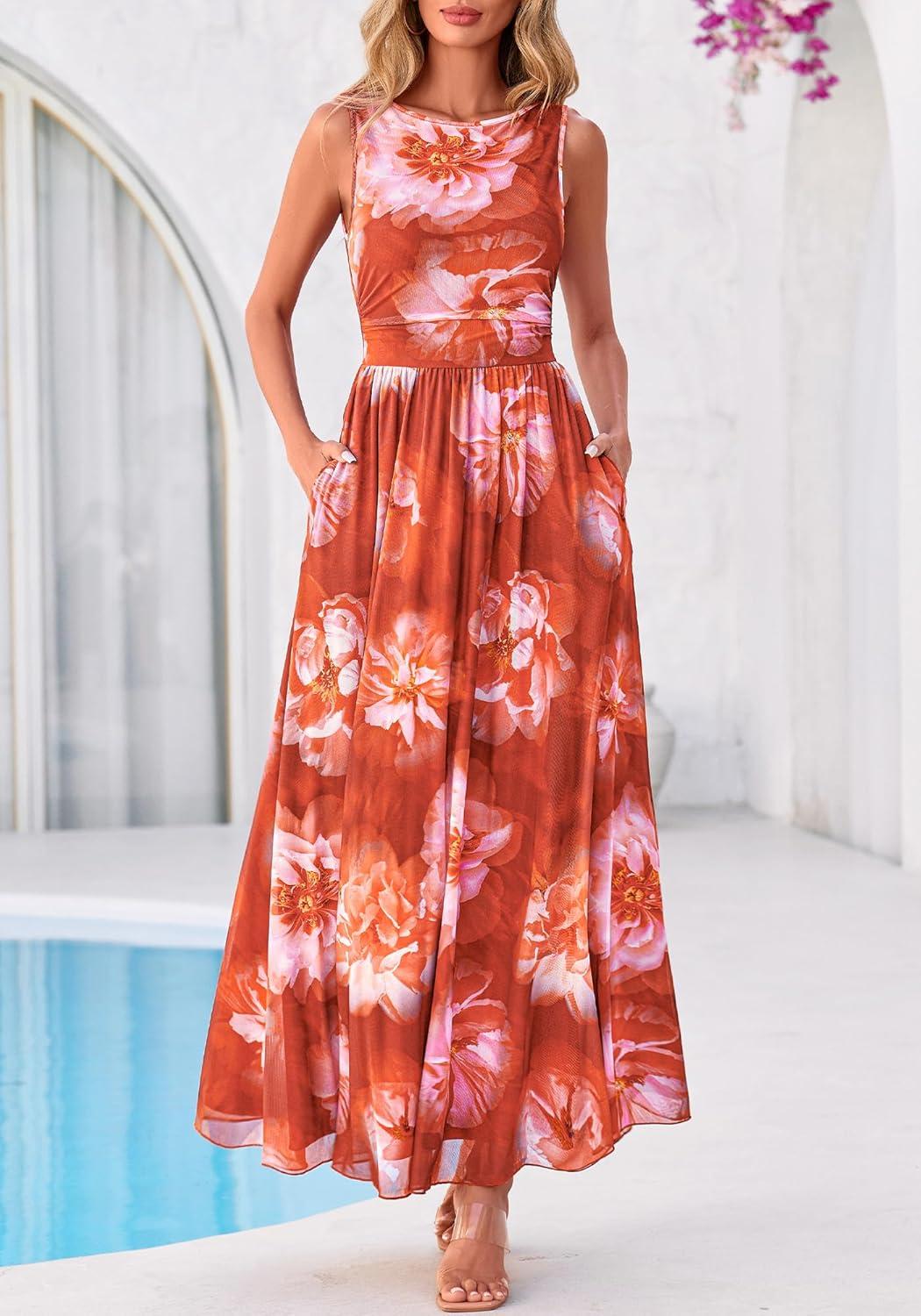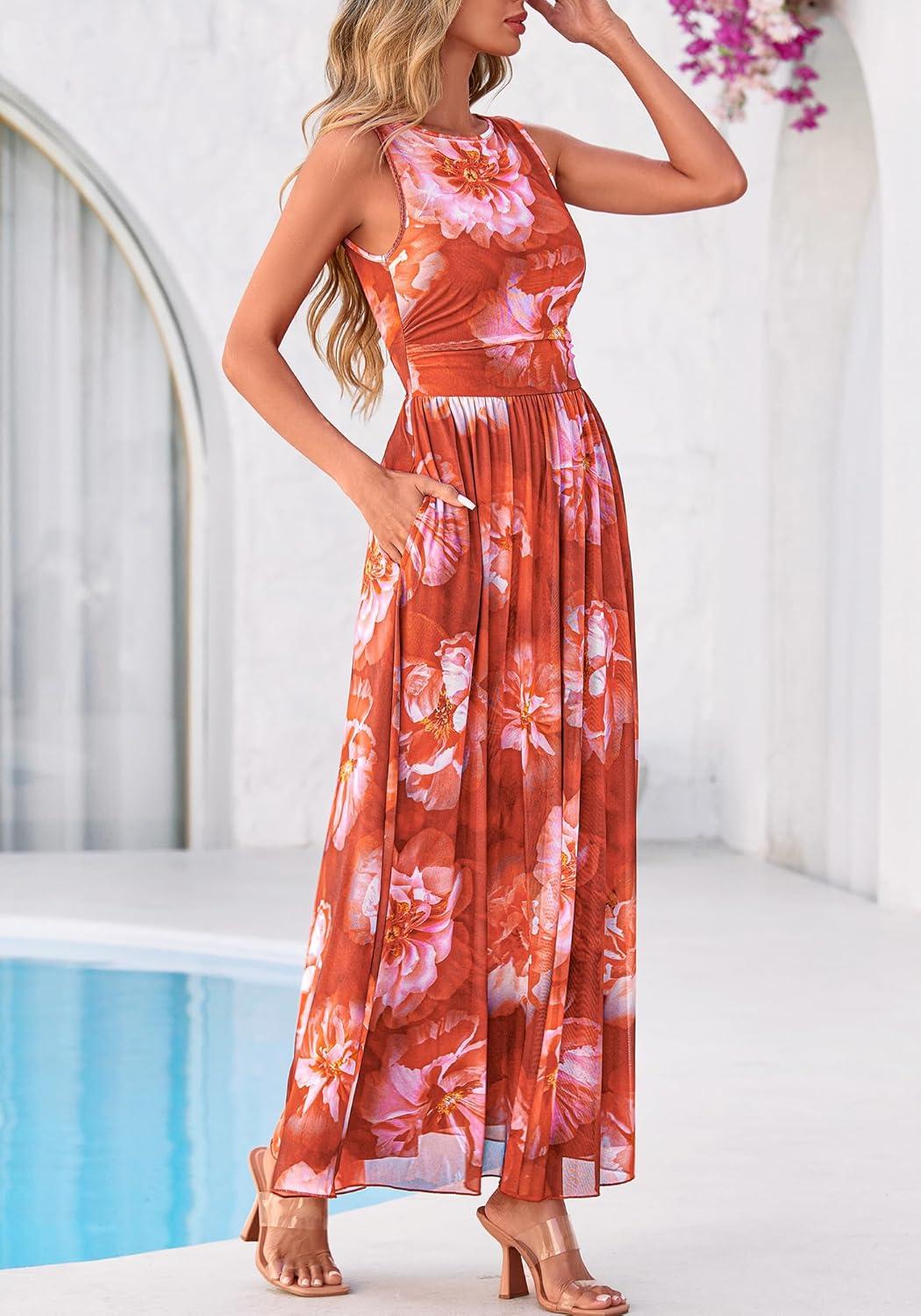 BTFBM Summer Dresses for Women 2026 Floral Maxi Dress Sleeveless Mesh Flowy Long Sundress Beach Vacation Clothes Pockets(Brown Red Flower)
