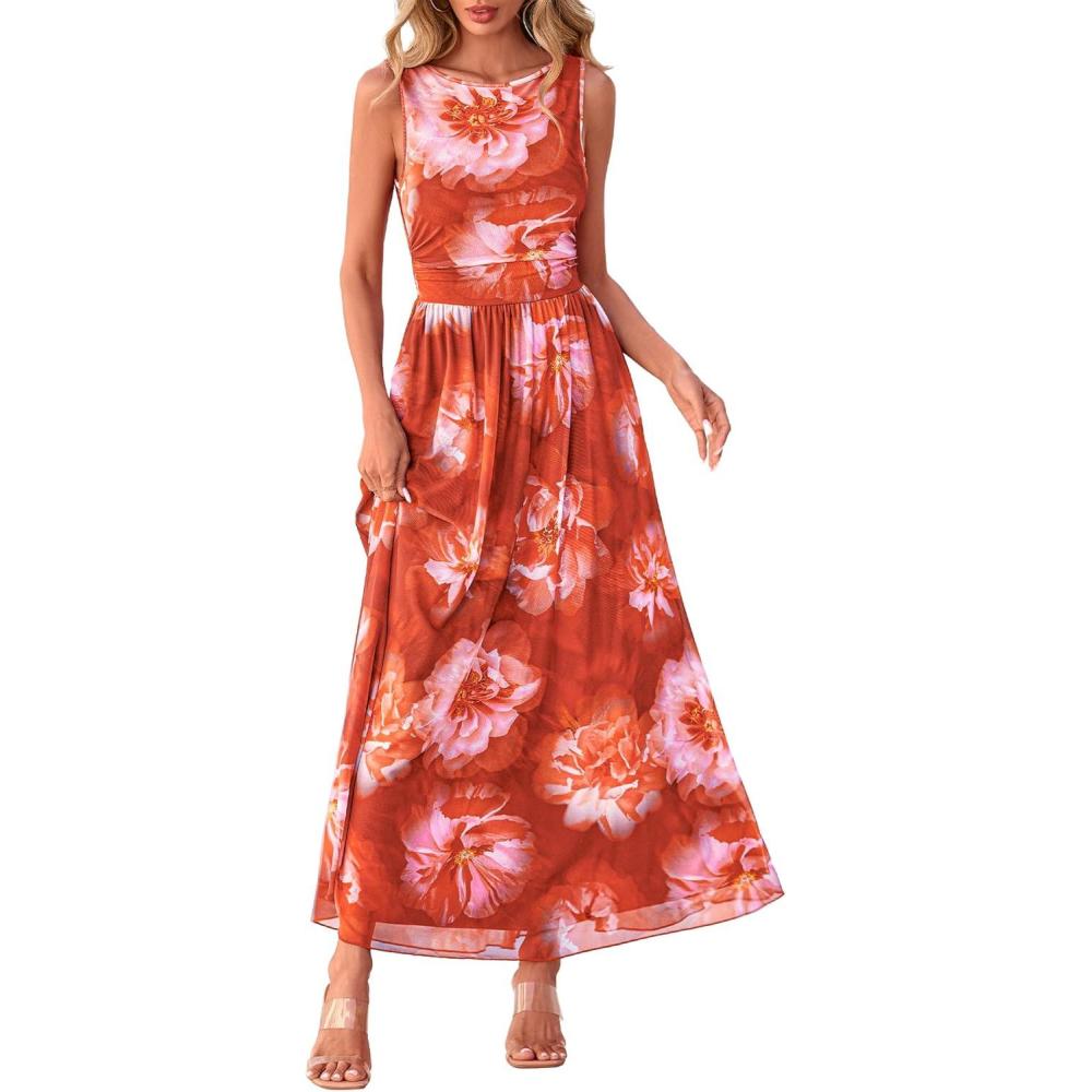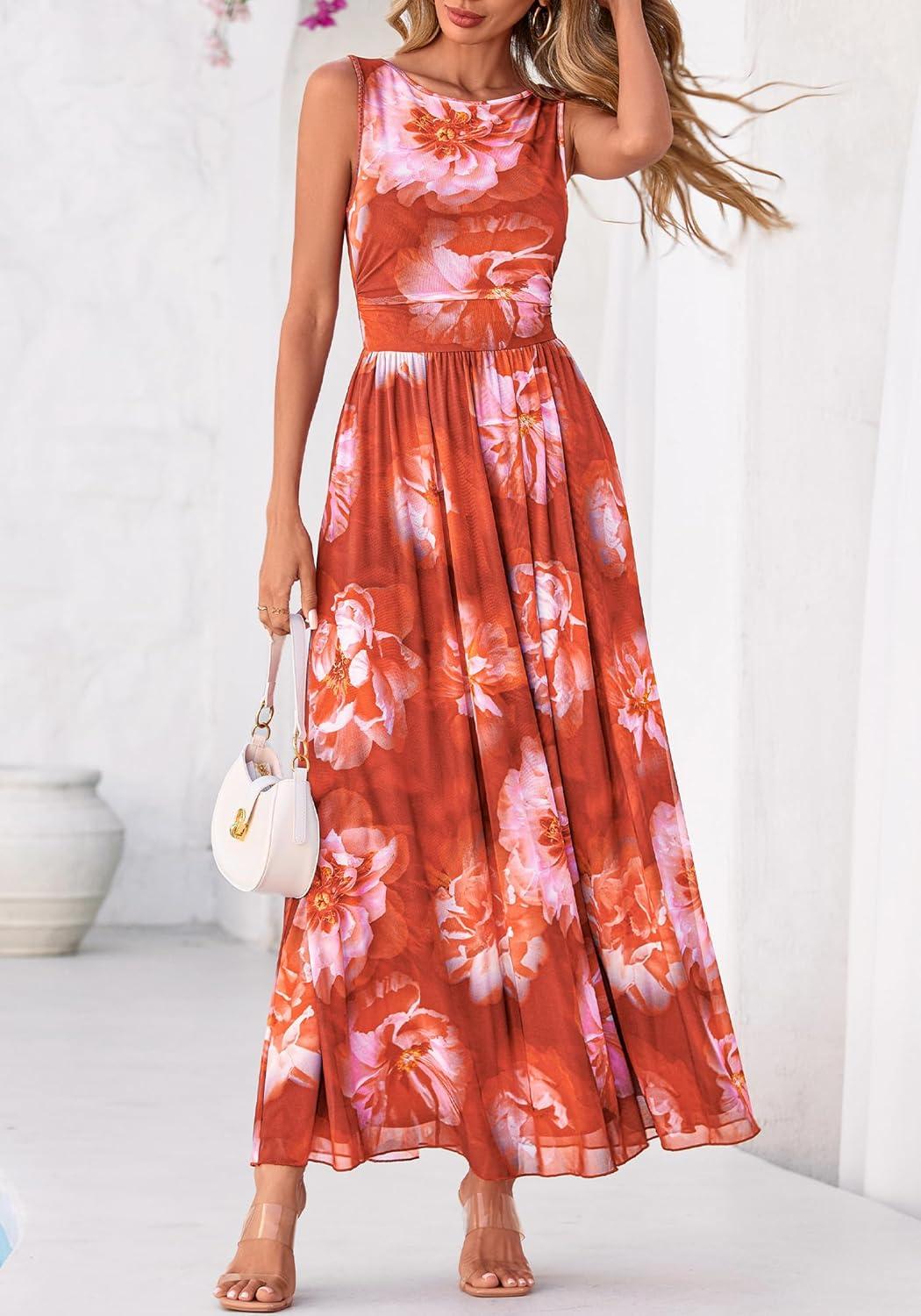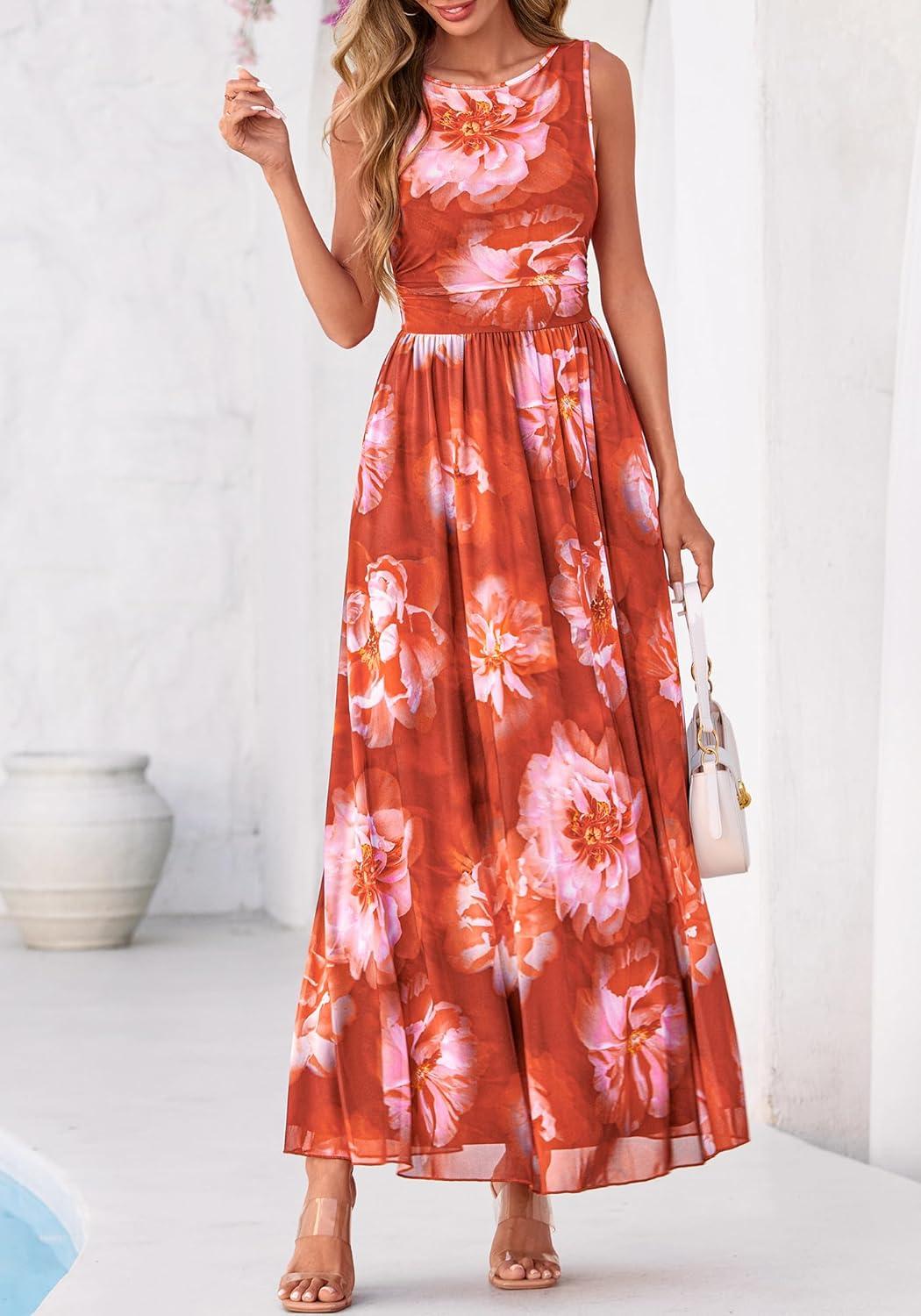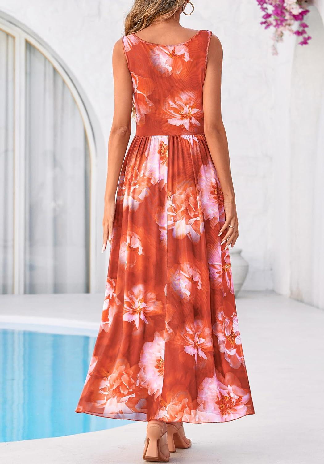 BTFBM Summer Dresses for Women 2026 Floral Maxi Dress Sleeveless Mesh Flowy Long Sundress Beach Vacation Clothes Pockets(Brown Red Flower)