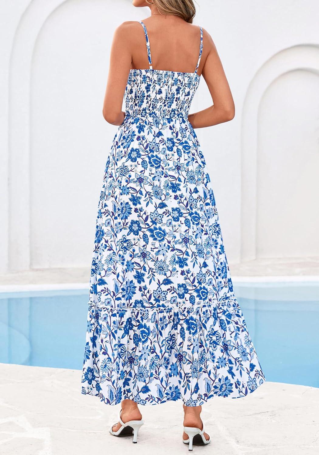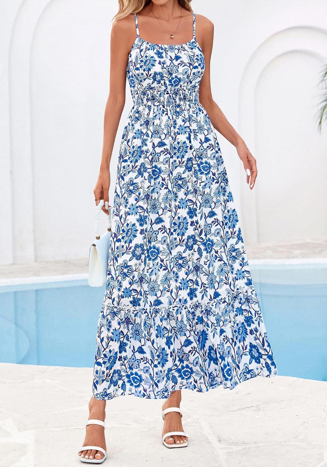 BTFBM Summer Dresses for Women 2026 Sleeveless Spaghetti Strap High Waist Boho Beach Vacation Clothes Spring Maxi Dress(Floral White Blue)
