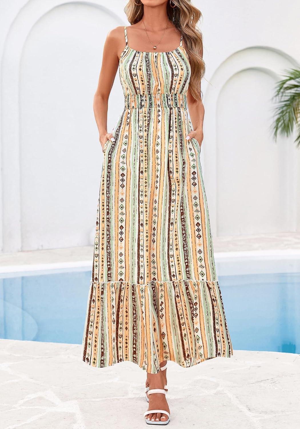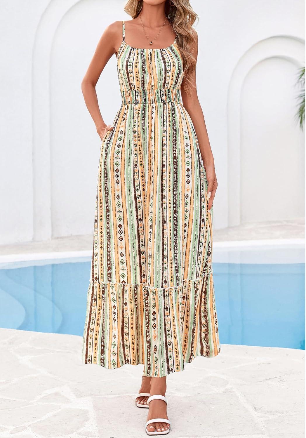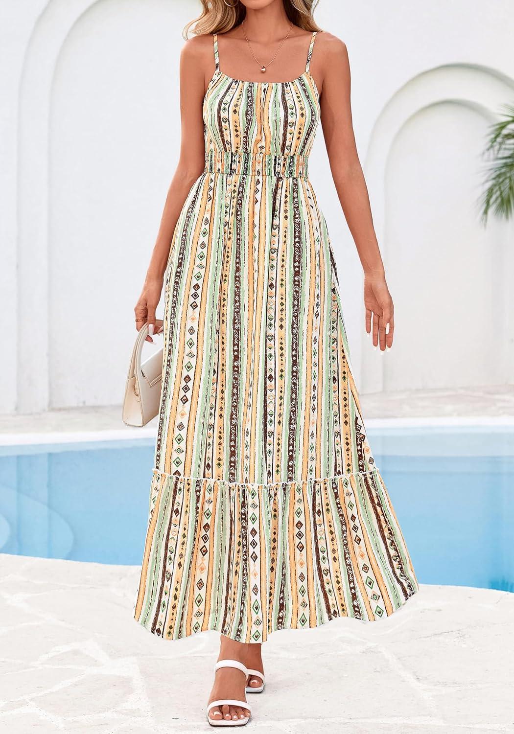 BTFBM Summer Dresses for Women 2026 Sleeveless Spaghetti Strap High Waist Boho Beach Vacation Clothes Spring Maxi Dress(Print Green Yellow)