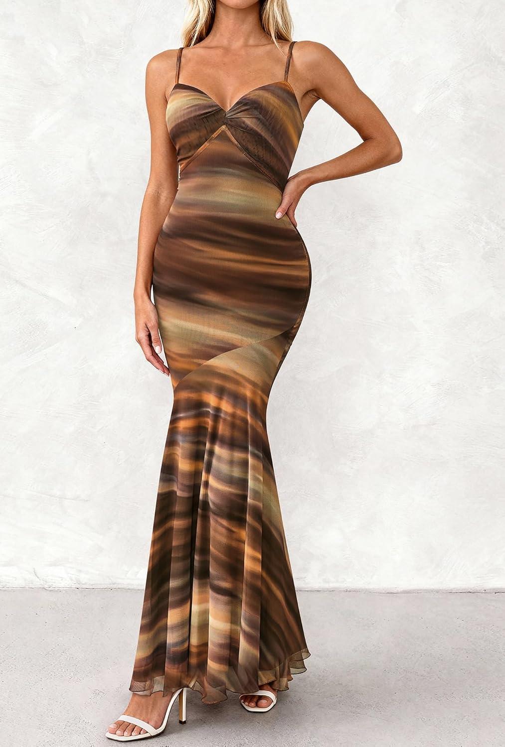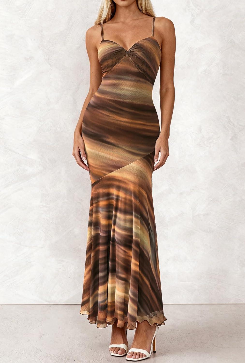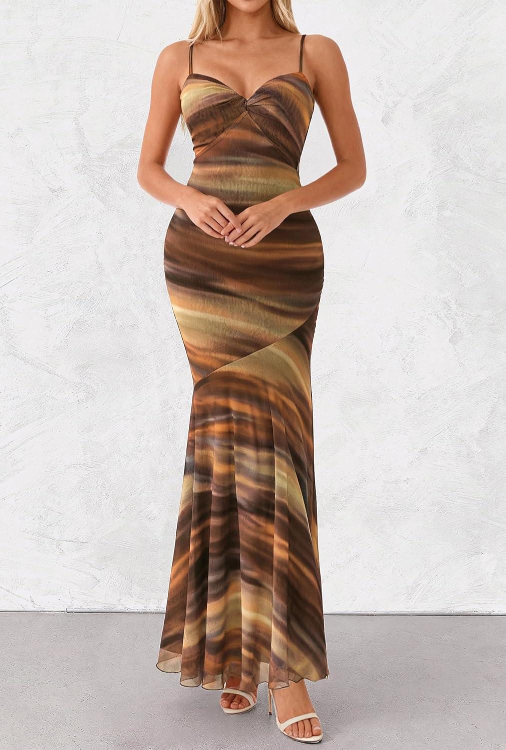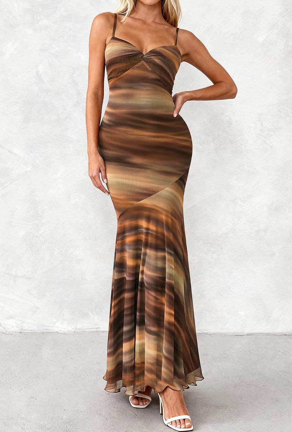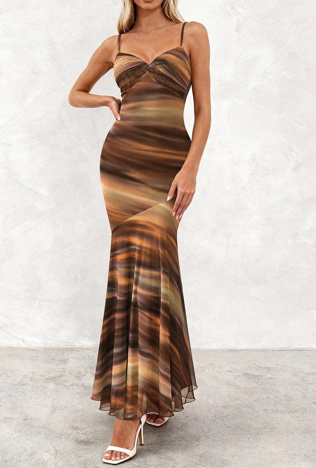 BTFBM Summer Dresses for Women 2026 Spaghetti Straps Sundress Twist Knot Mesh Mermaid Wedding Guest Dress Beach Vacation(Print Brown)