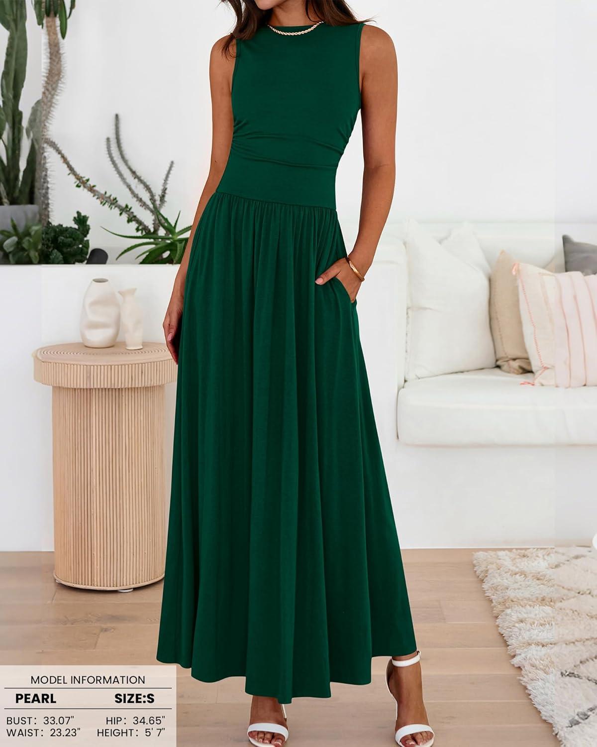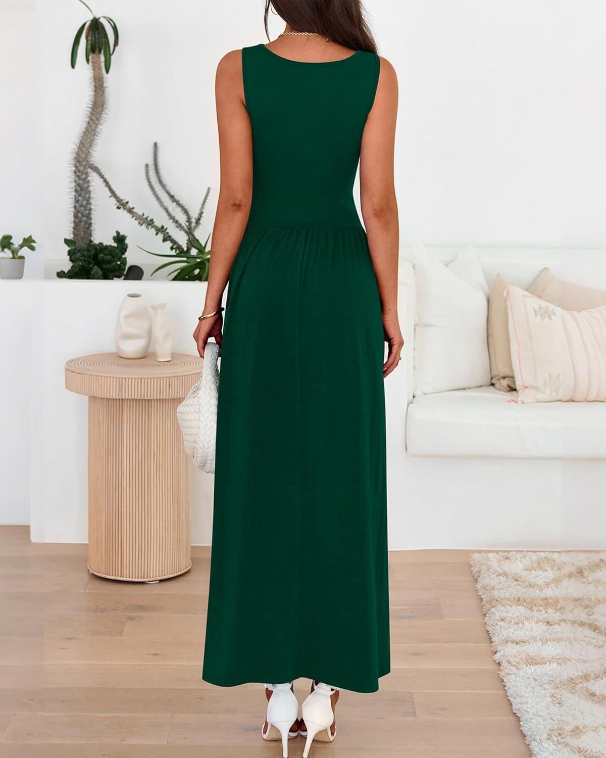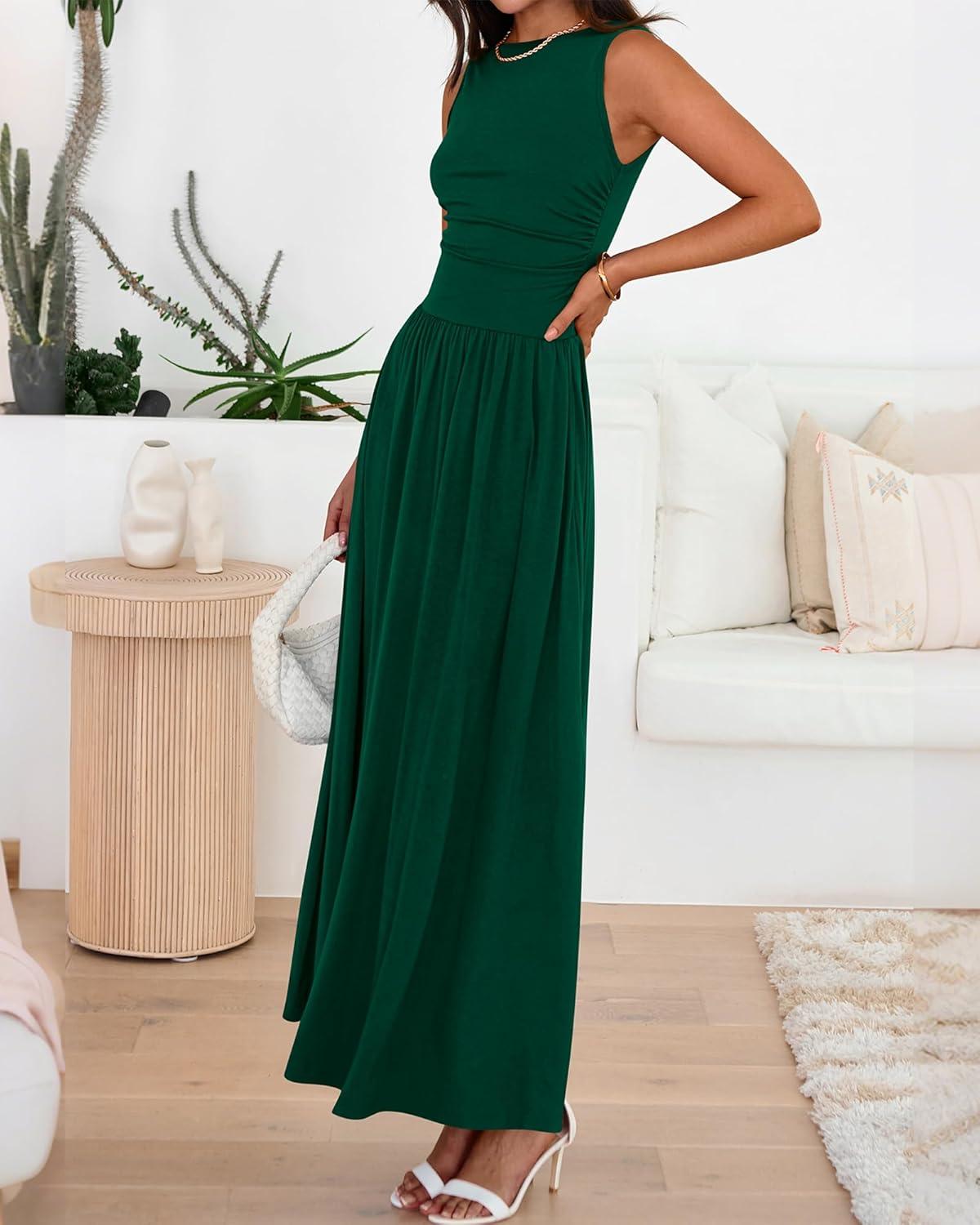 BTFBM Summer Maxi Dresses for Women 2026 Spring Sleeveless Casual Ruched High Waisted Long Sundress Flowy Beach Dress(Dark Green)