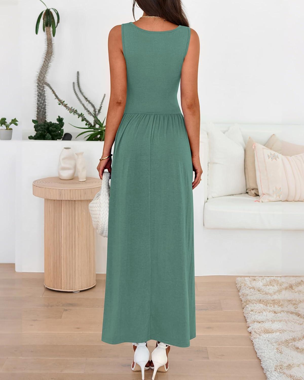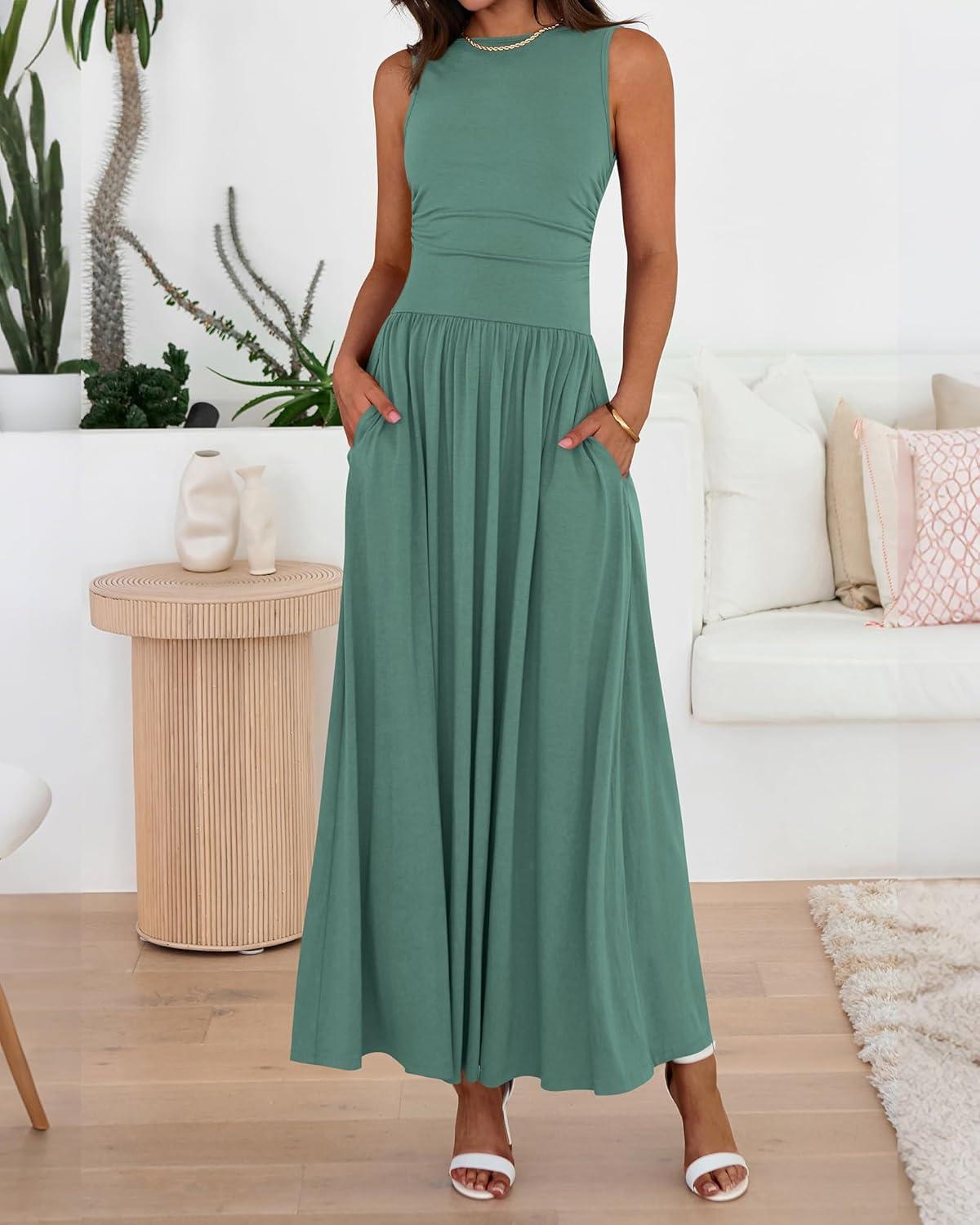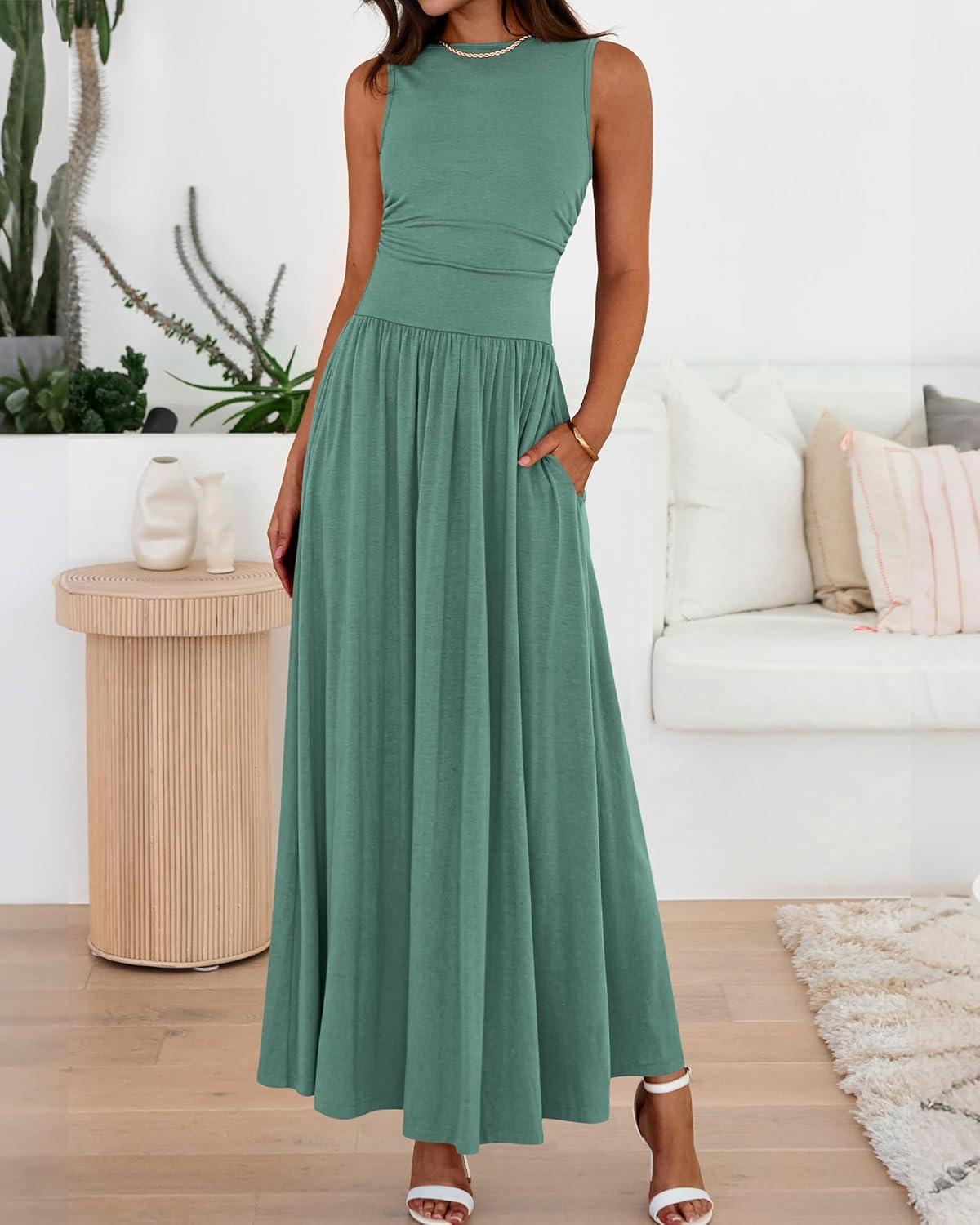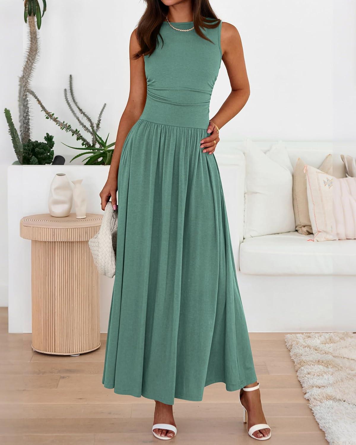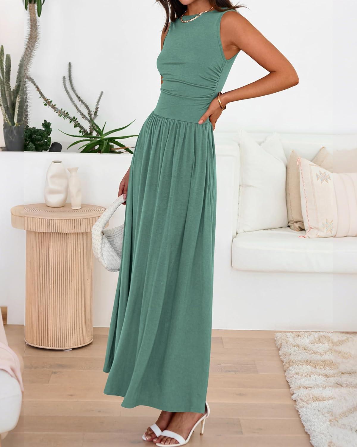 BTFBM Summer Maxi Dresses for Women 2026 Spring Sleeveless Casual Ruched High Waisted Long Sundress Flowy Beach Dress(Sage Green)