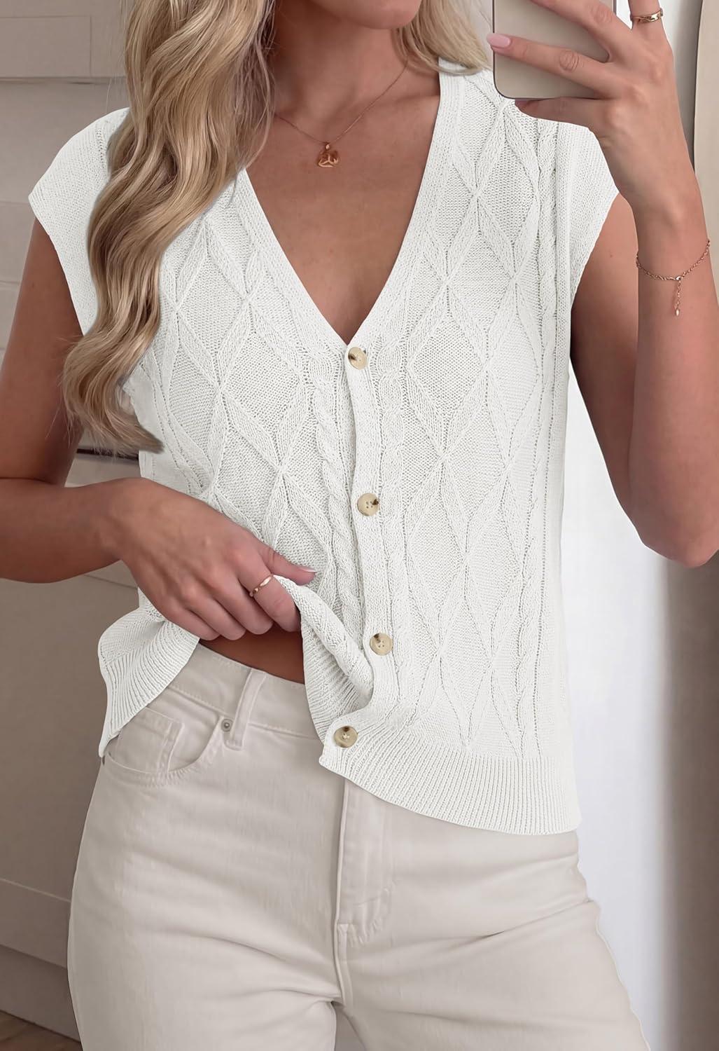 BTFBM Sweater Vest Women V Neck Cap Sleeve Button Down Knit Tops Spring Summer 2026 Loose Lightweight Cardigan Vests(White)