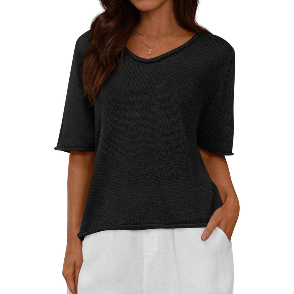 BTFBM Sweaters for Women 2026 Summer Oversized Half Short Sleeve Knitted Pullover V Neck‌ Casual Loose Fit Spring Tops(Black)