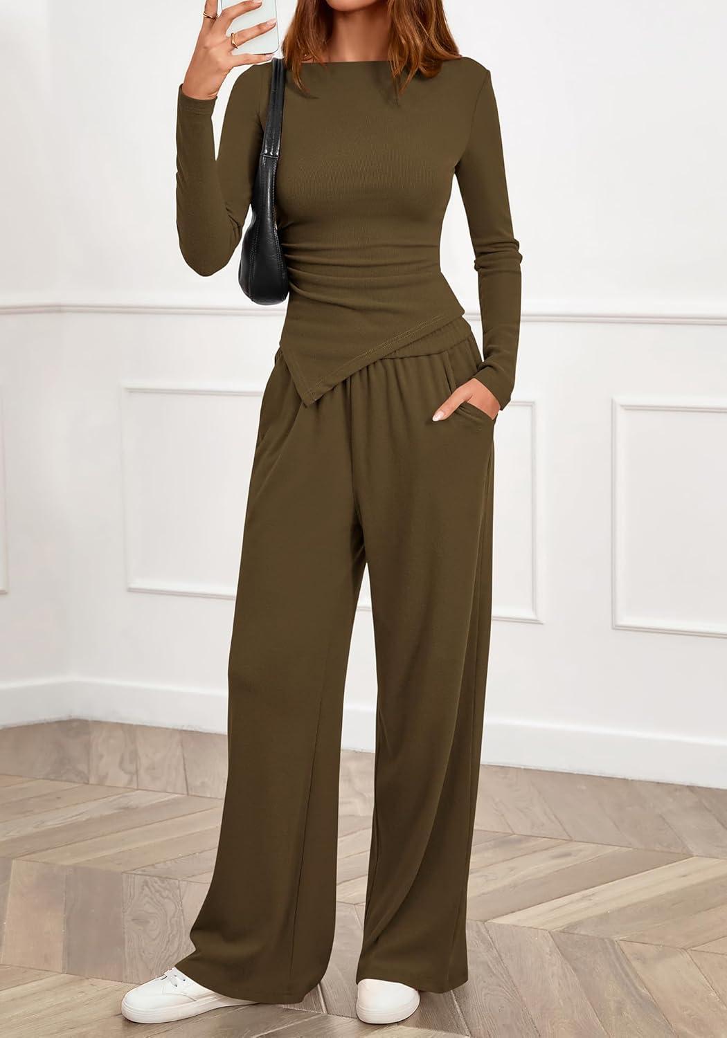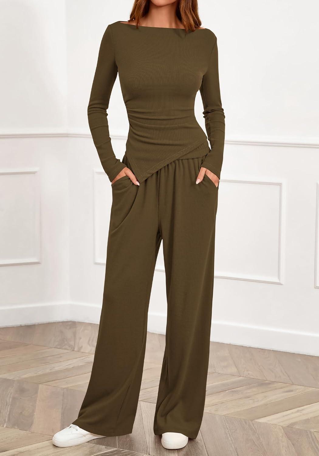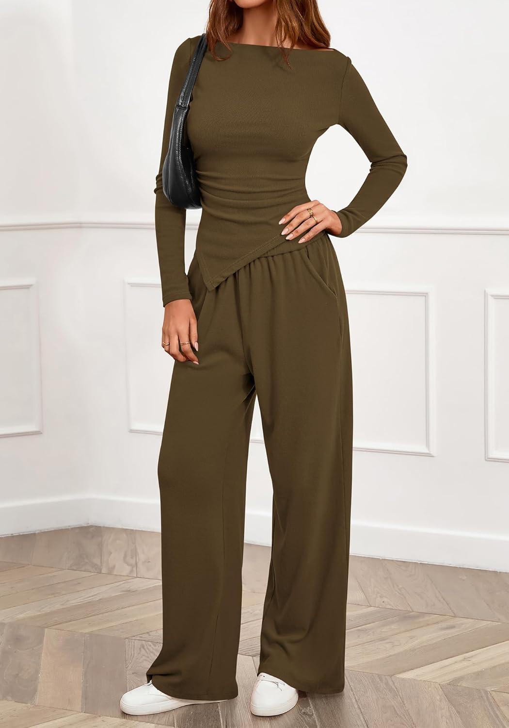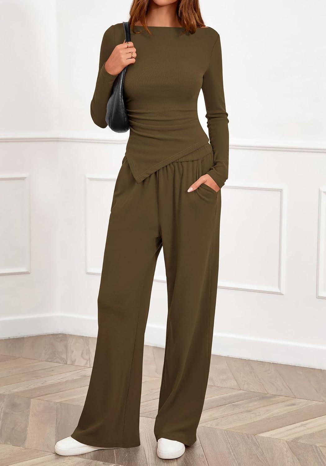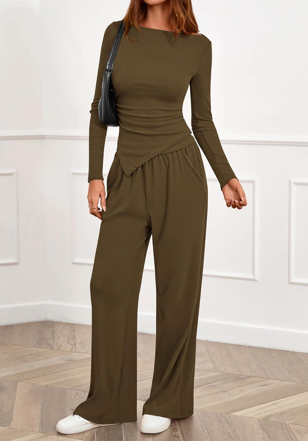 BTFBM Two Piece Sets For Women 2025 Asymmetrical Boat Neck Wide Leg Pants Lounge Set Airport Outfits Fall Clothes(Army Green)
