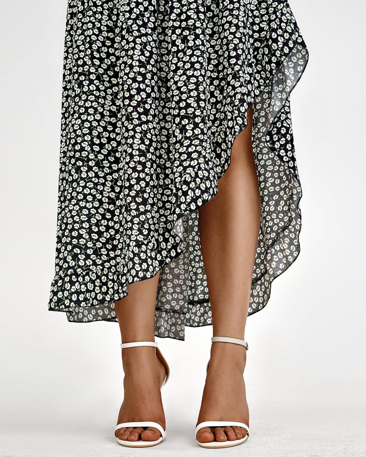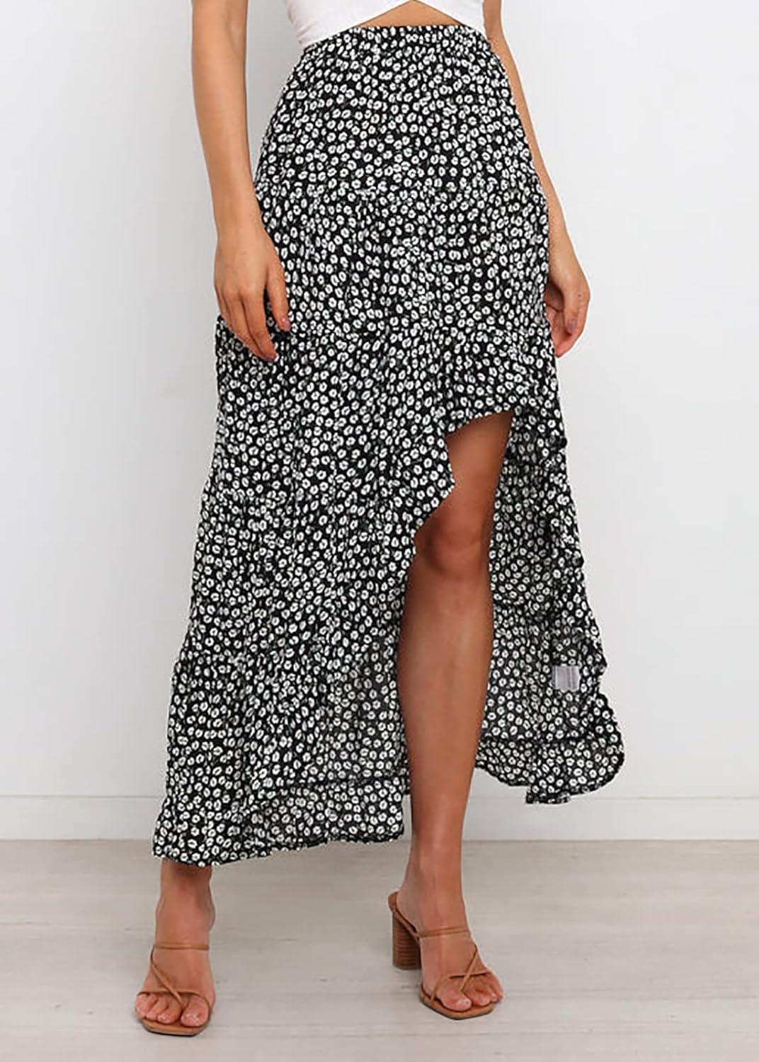 BTFBM Women 2026 Spring Summer Long Skirts Dress Boho Floral Elastic Waist Split Ruffle High Low Beach Maxi Skirt Clothes(Black White)