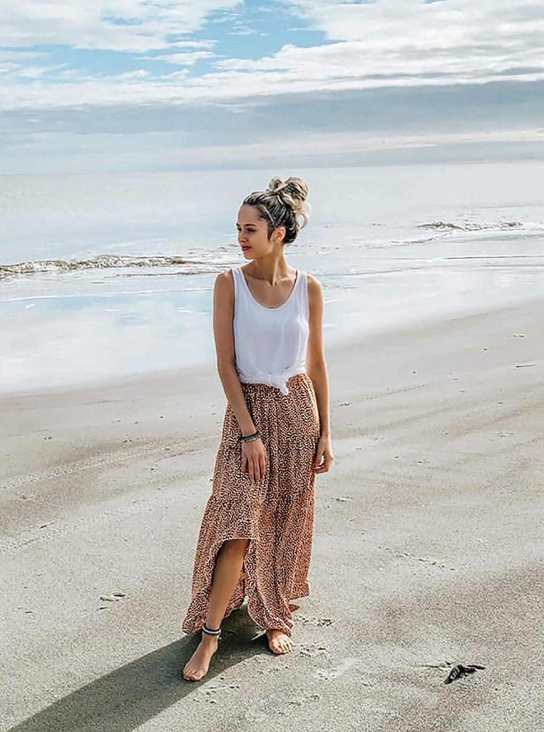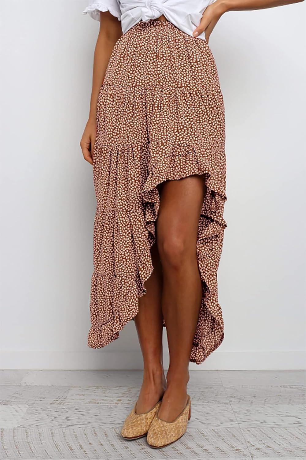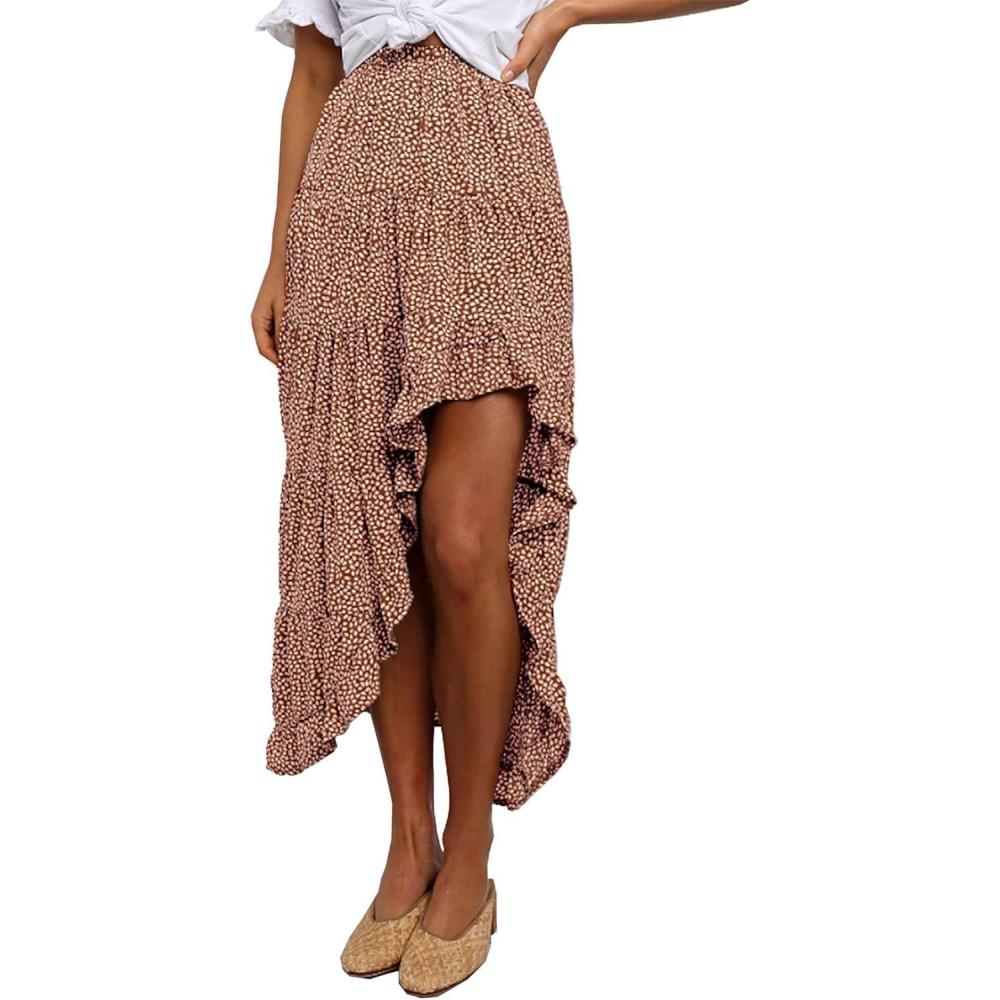 BTFBM Women 2026 Spring Summer Long Skirts Dress Boho Floral Elastic Waist Split Ruffle High Low Beach Maxi Skirt Clothes(Coffee)