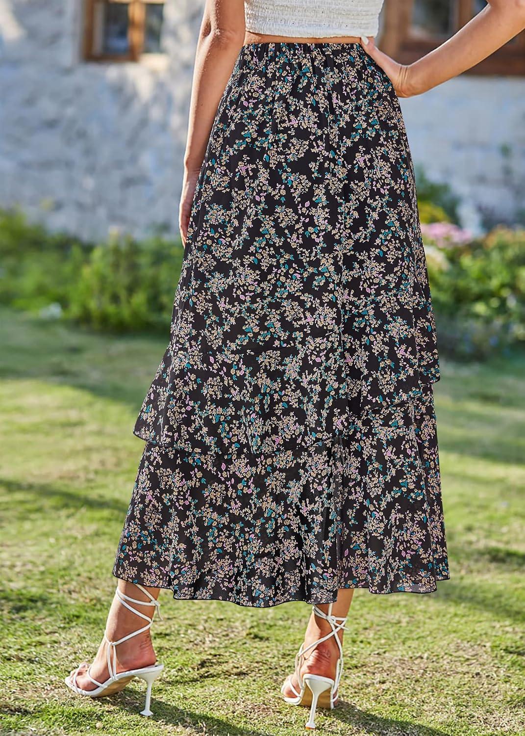 BTFBM Women 2026 Spring Summer Long Skirts Dress Boho Floral Elastic Waist Split Ruffle High Low Beach Maxi Skirt Clothes(Print Floral Black)
