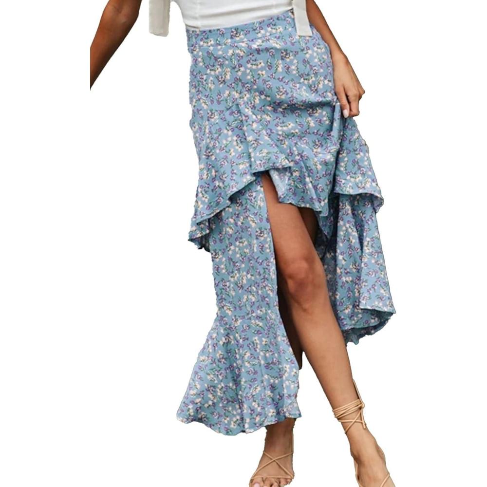 BTFBM Women 2026 Spring Summer Long Skirts Dress Boho Floral Elastic Waist Split Ruffle High Low Beach Maxi Skirt Clothes(Z-blue)