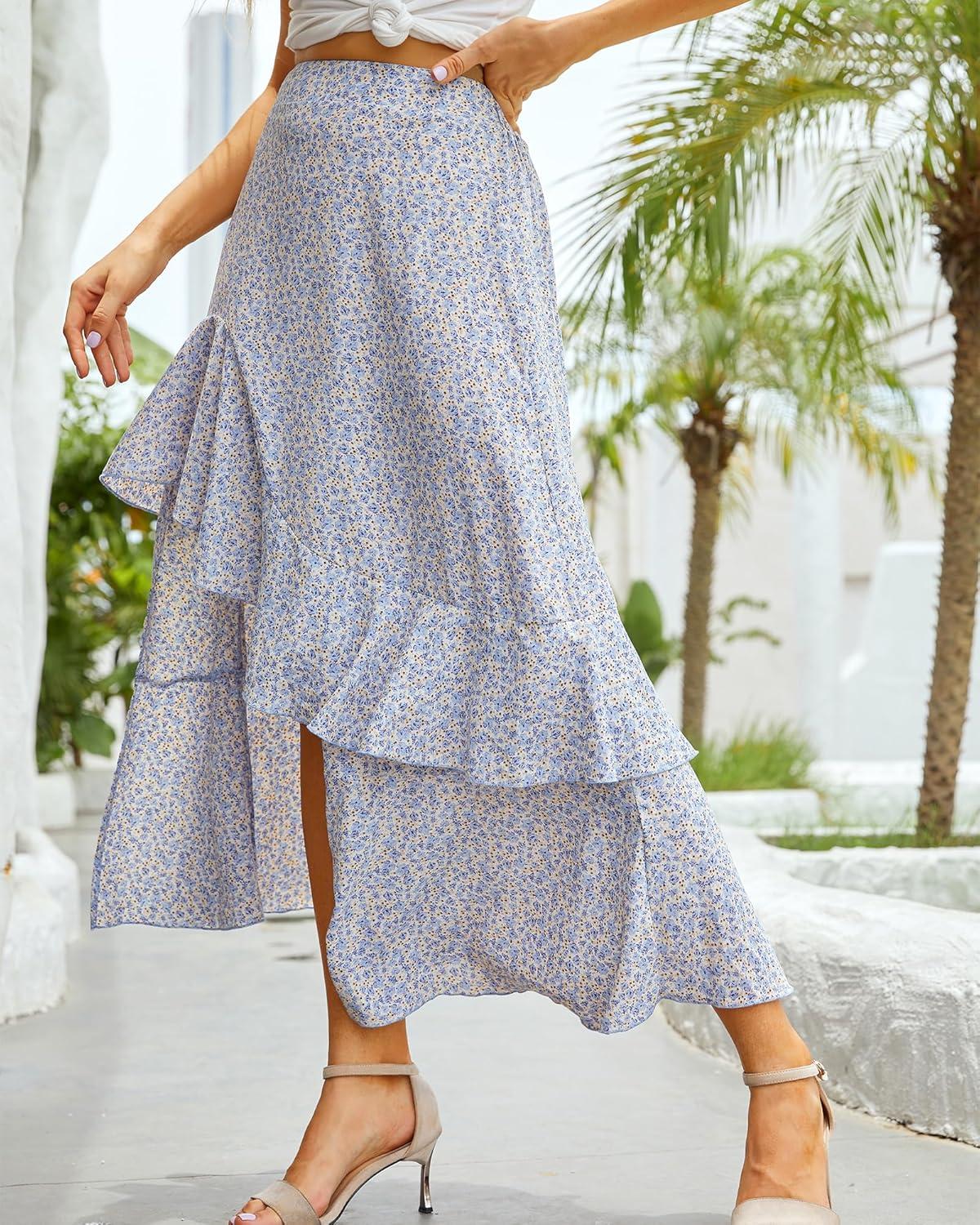 BTFBM Women 2026 Spring Summer Long Skirts Dress Boho Floral Elastic Waist Split Ruffle High Low Beach Maxi Skirt Clothes(Z-light Blue)