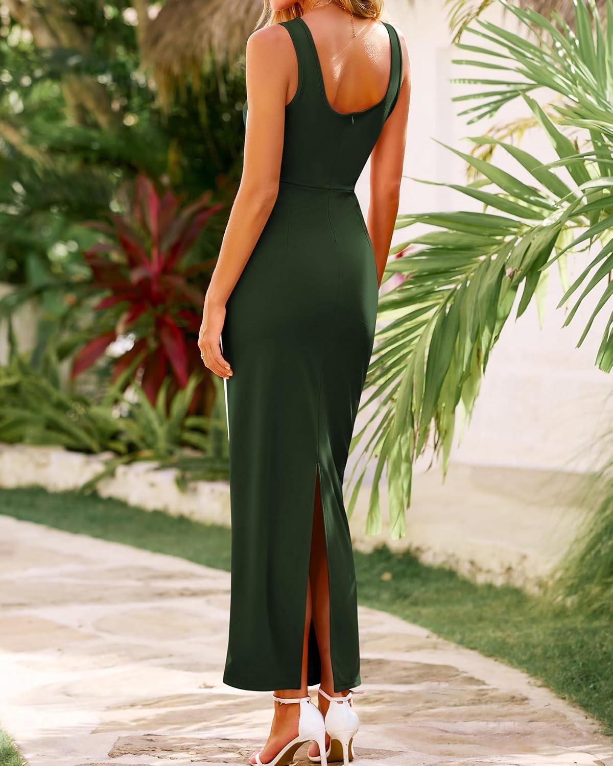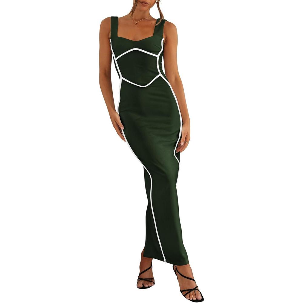 BTFBM Women Bodycon Maxi Dress Square Neck Sleeveless Contrast Binding Slit Cocktail Formal Wedding Guest Dresses 2025(Dark Green)