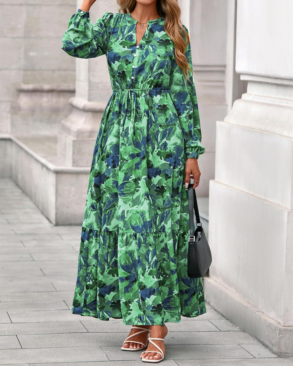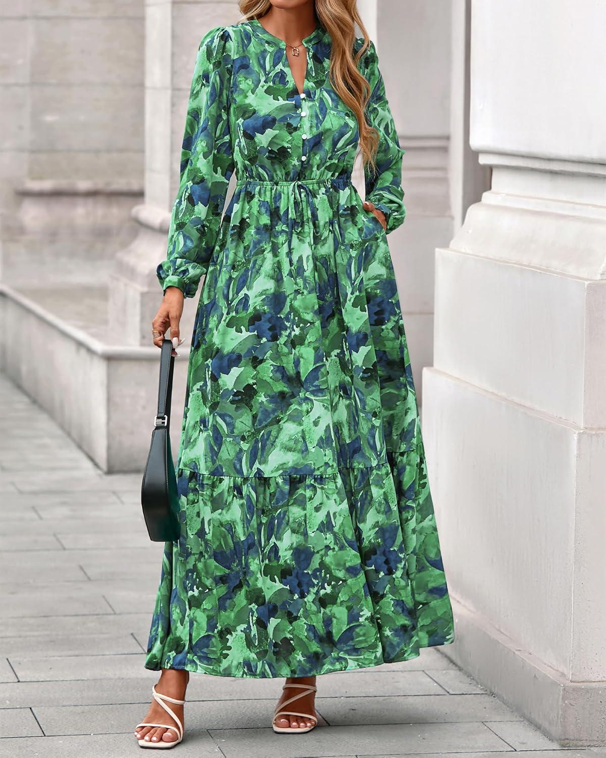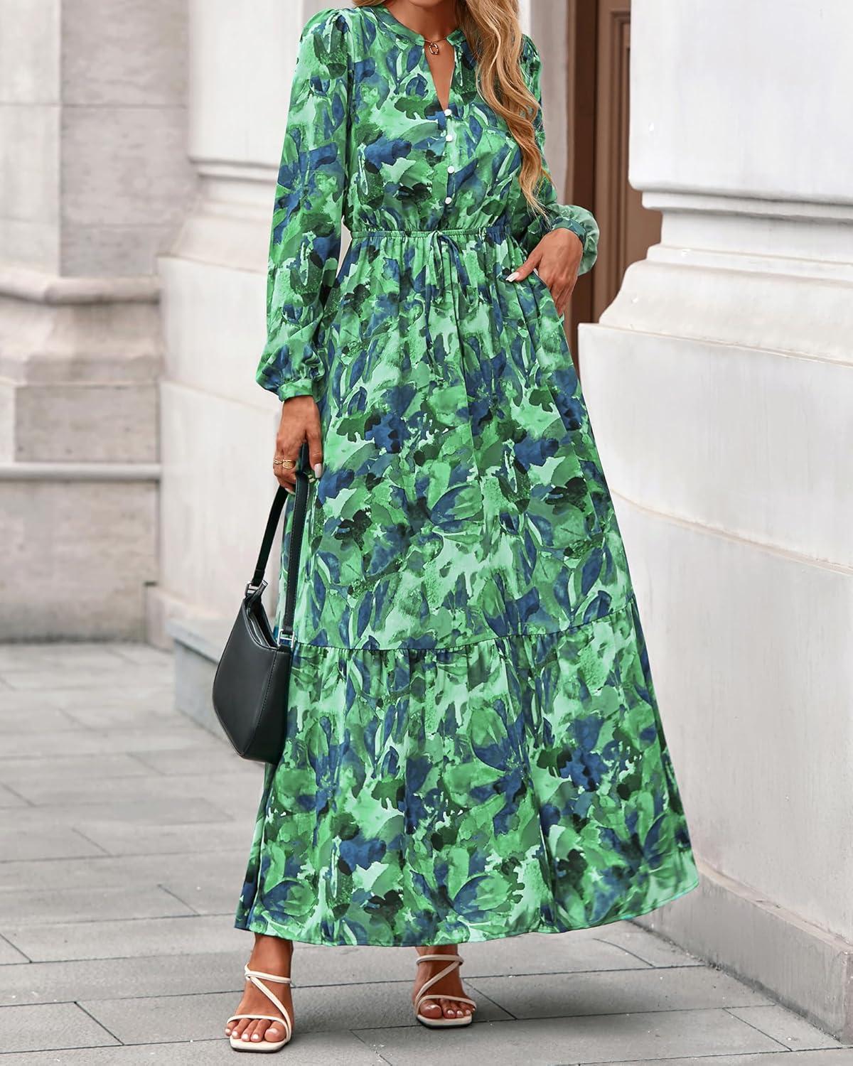 BTFBM Women Boho Maxi Dress Fall Fashion 2025 Floral Long Sleeve V Neck Button Pockets Flowy Vacation Wedding Dresses(Green)