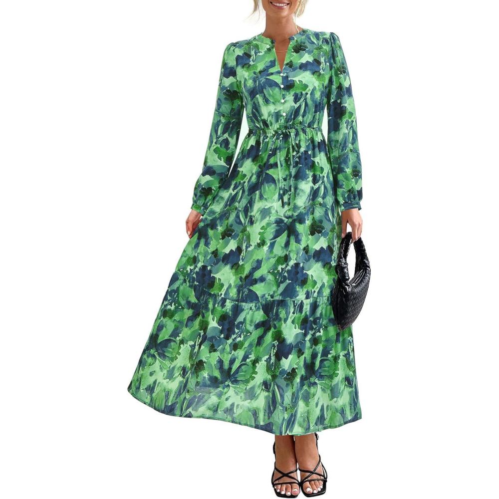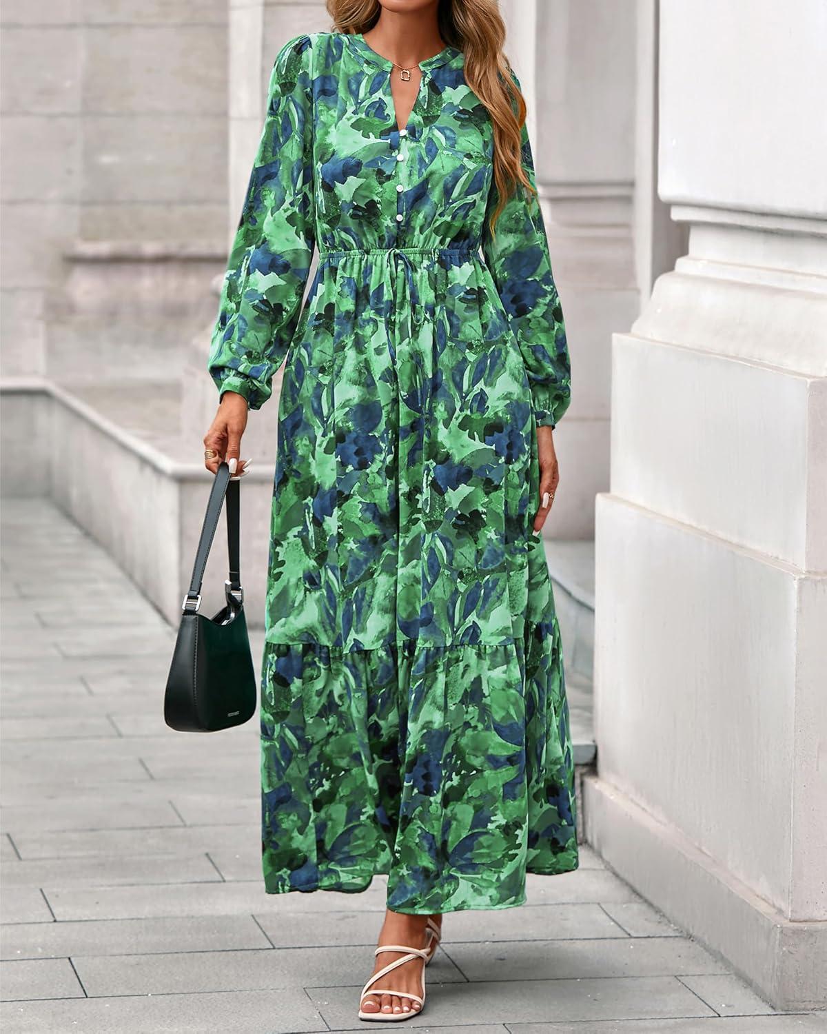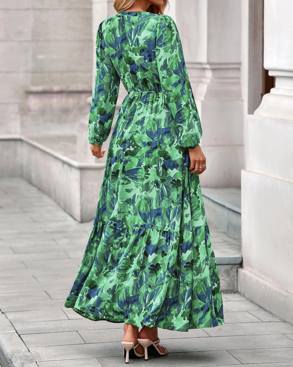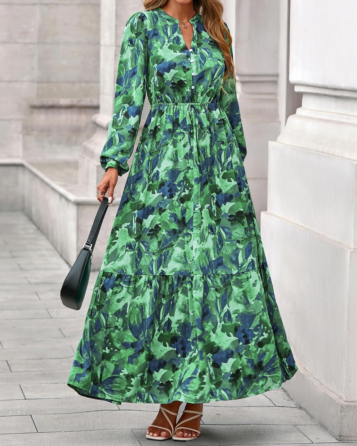 BTFBM Women Boho Maxi Dress Fall Fashion 2025 Floral Long Sleeve V Neck Button Pockets Flowy Vacation Wedding Dresses(Green)