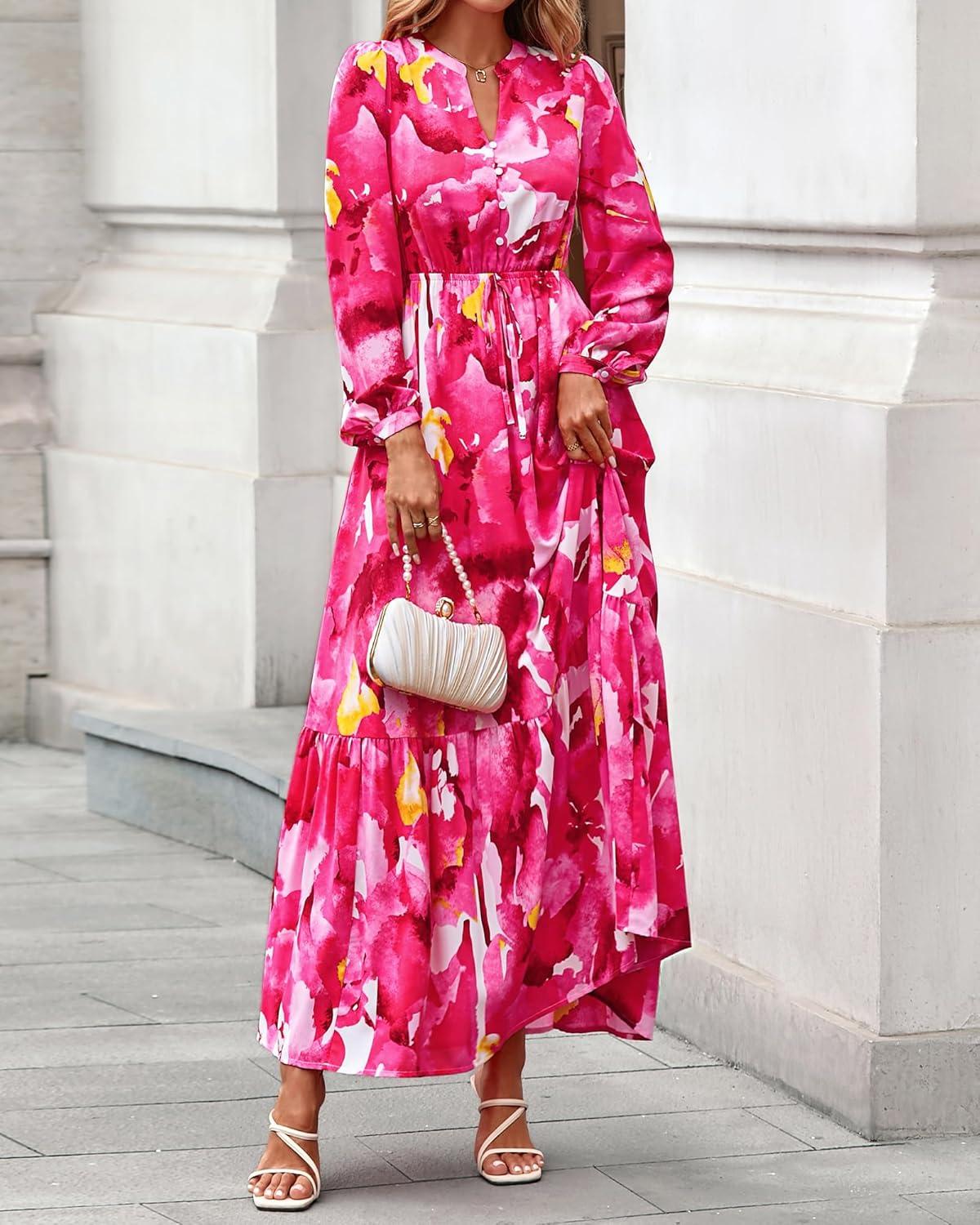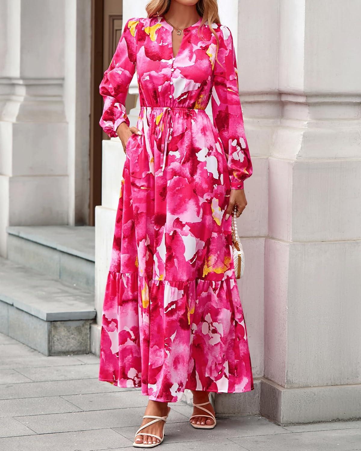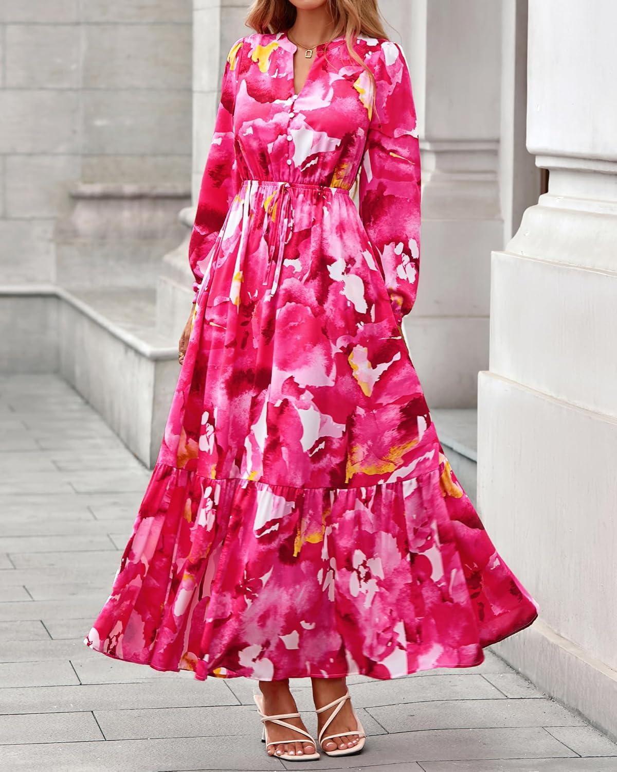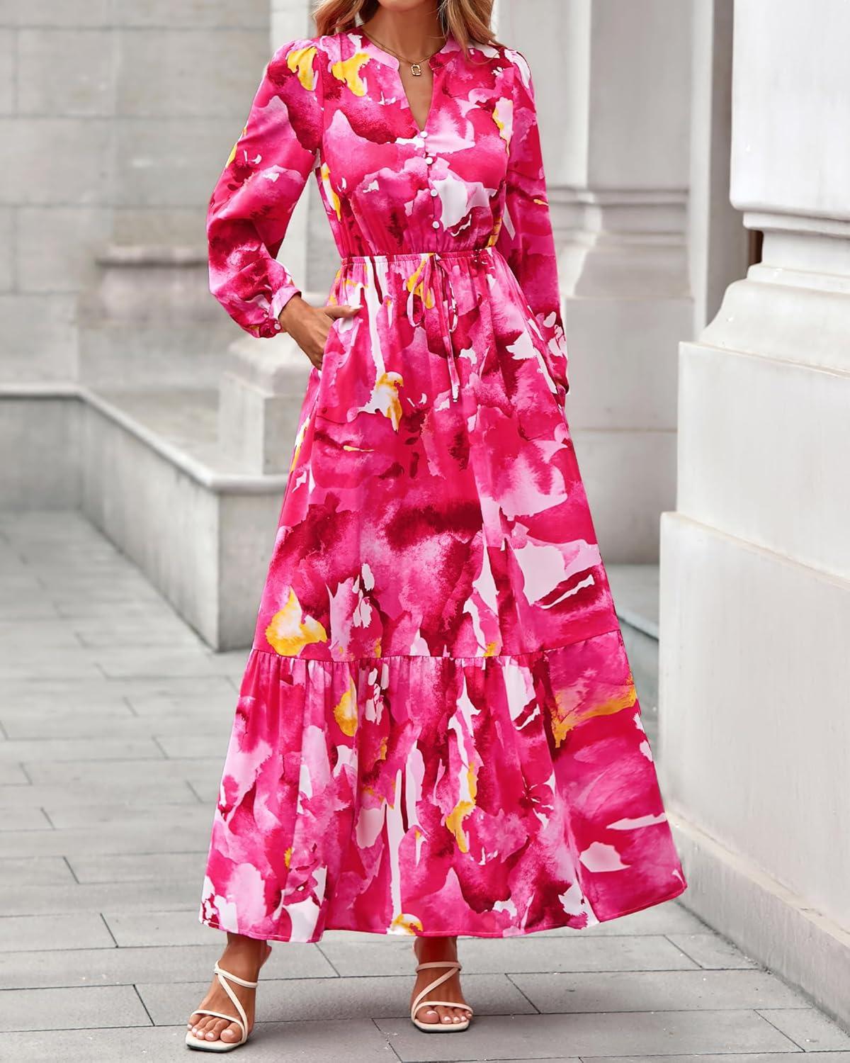 BTFBM Women Boho Maxi Dress Fall Fashion 2025 Floral Long Sleeve V Neck Button Pockets Flowy Vacation Wedding Dresses(Watercolour Rose Pink)