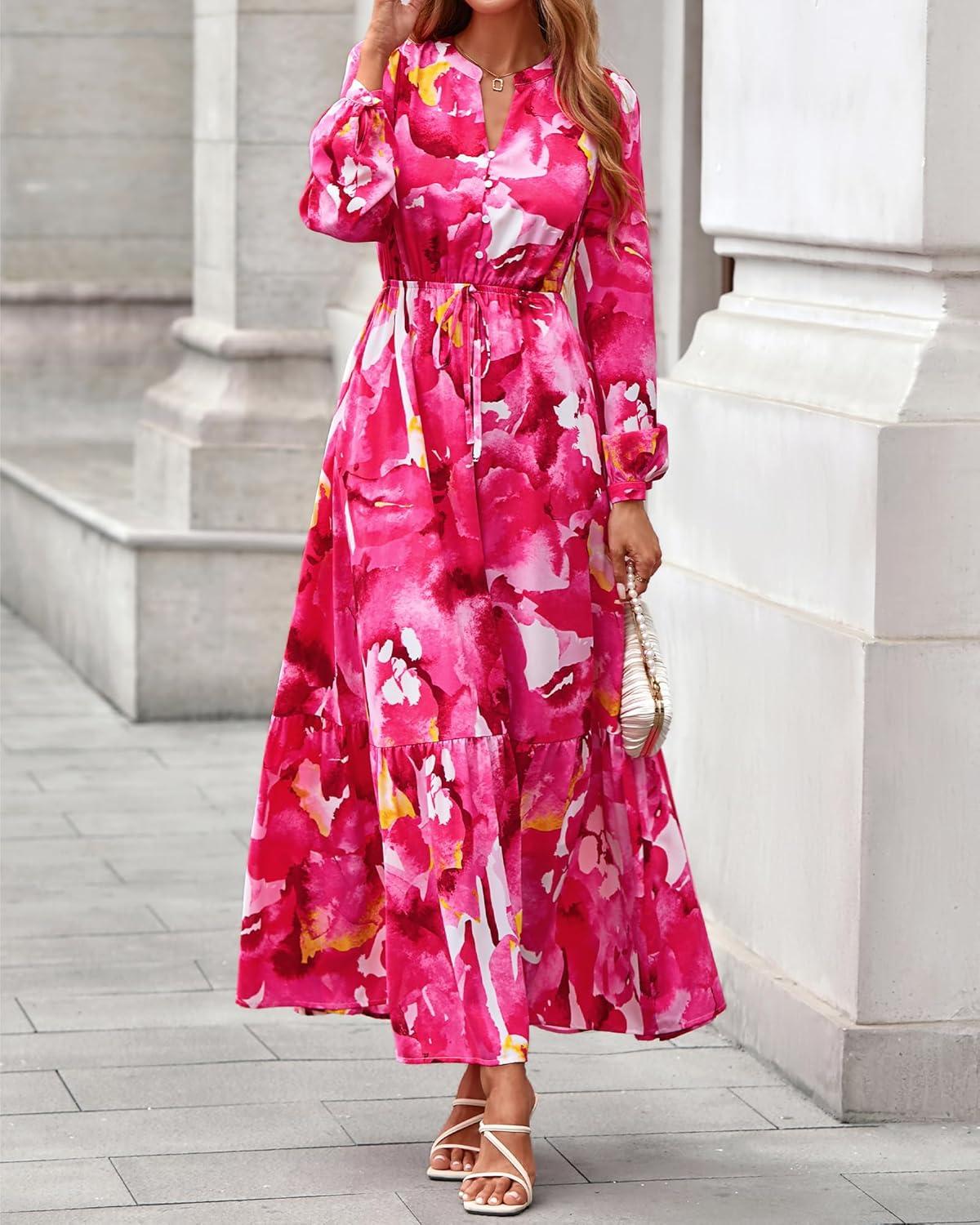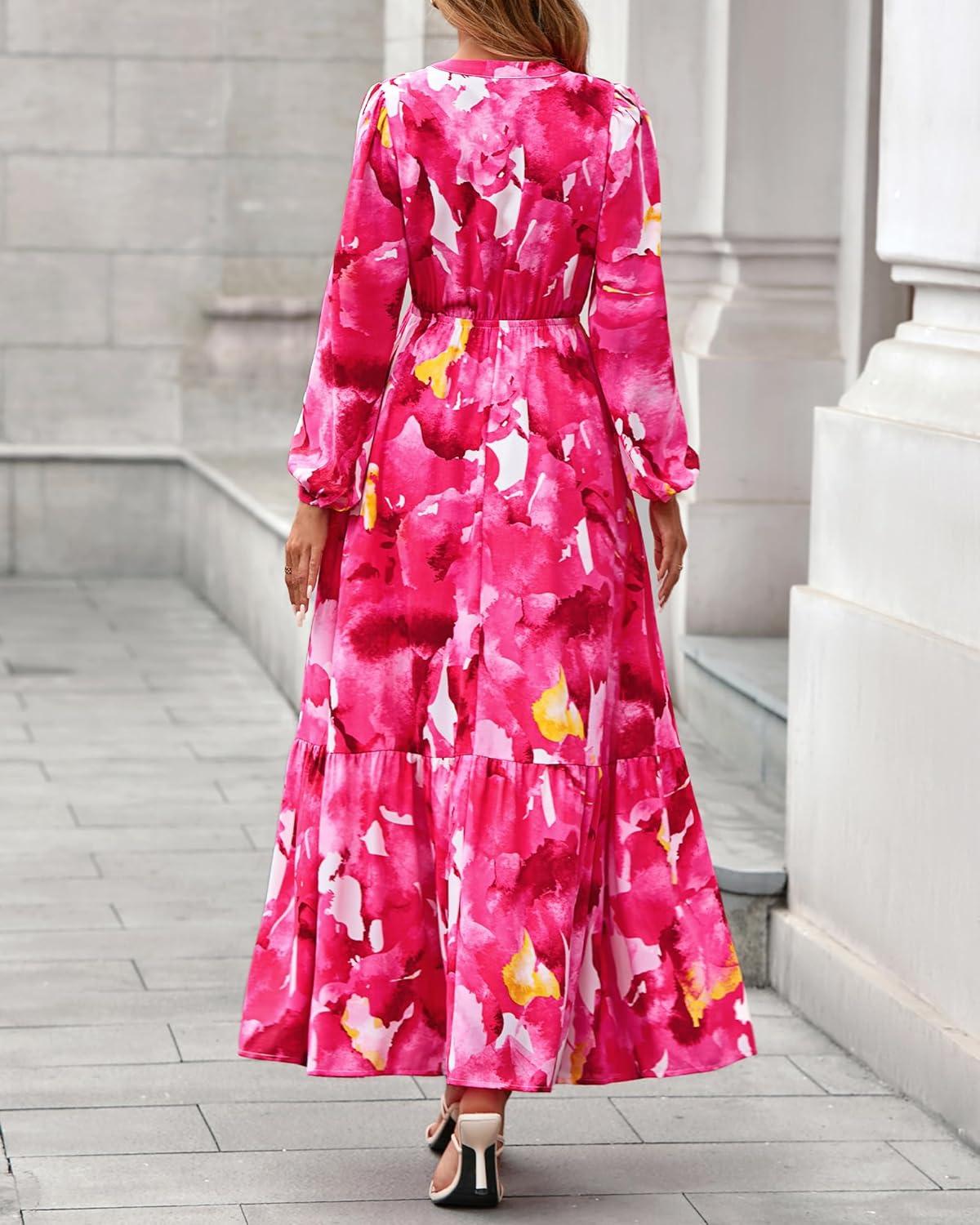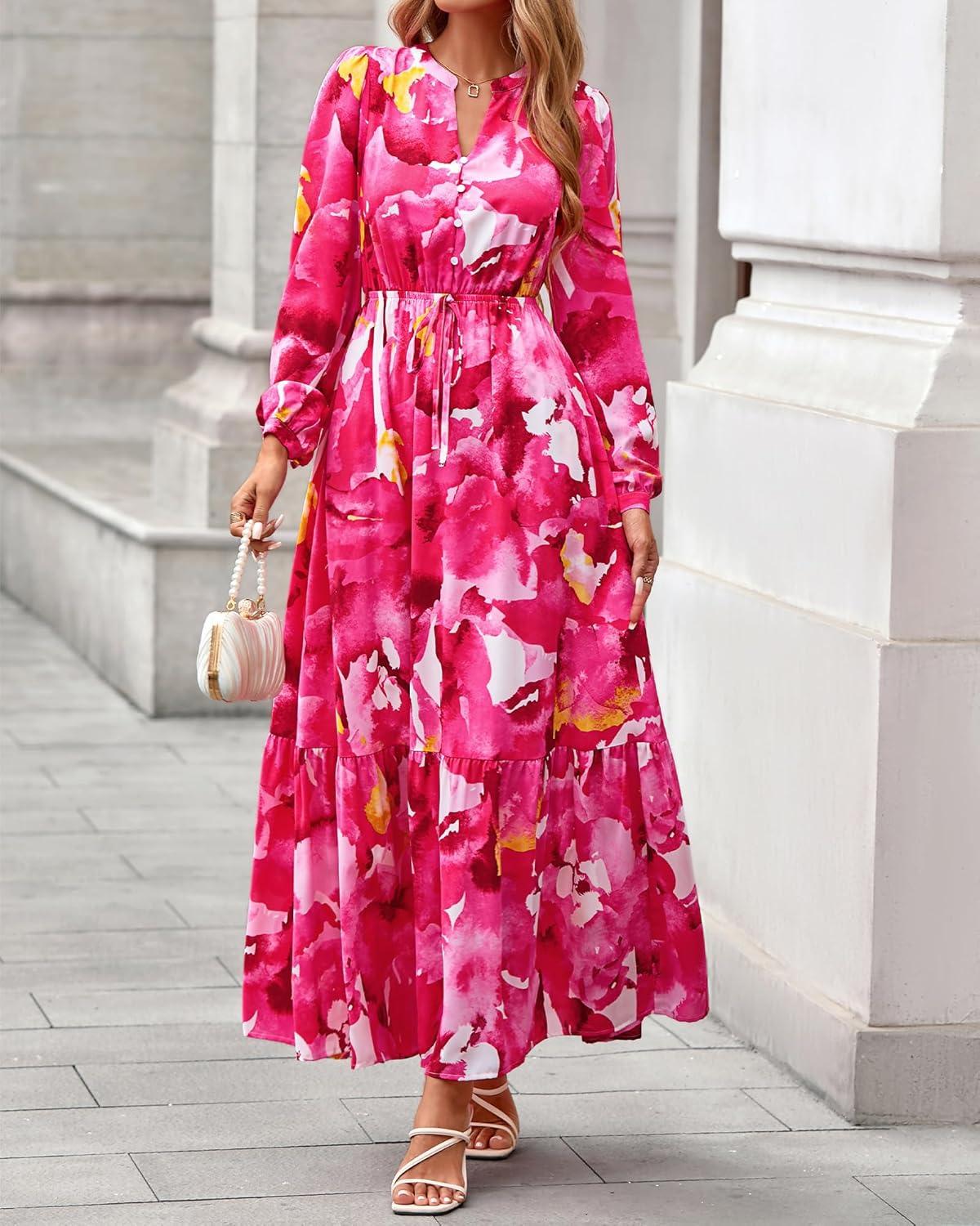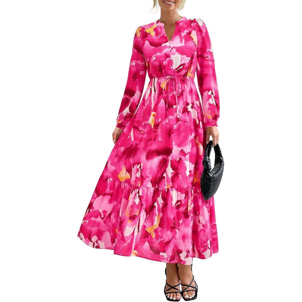 BTFBM Women Boho Maxi Dress Fall Fashion 2025 Floral Long Sleeve V Neck Button Pockets Flowy Vacation Wedding Dresses(Watercolour Rose Pink)