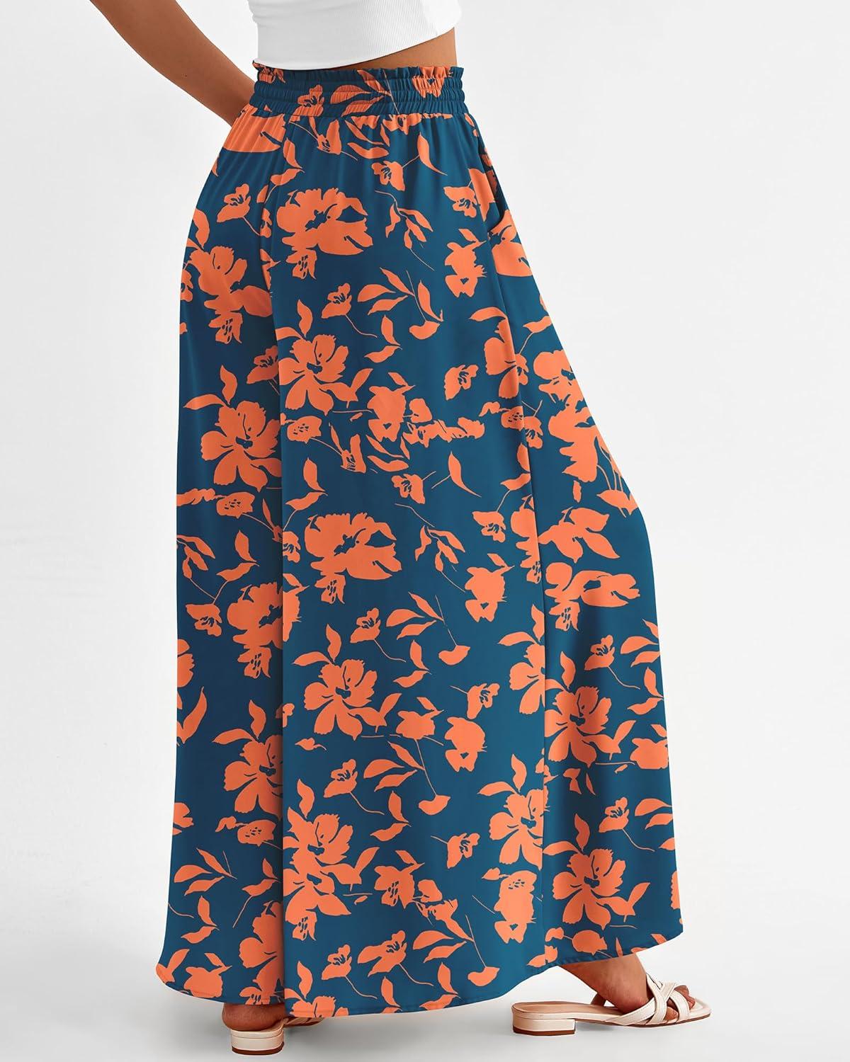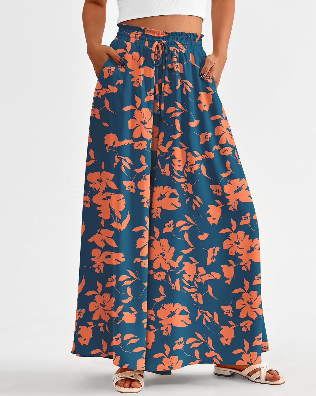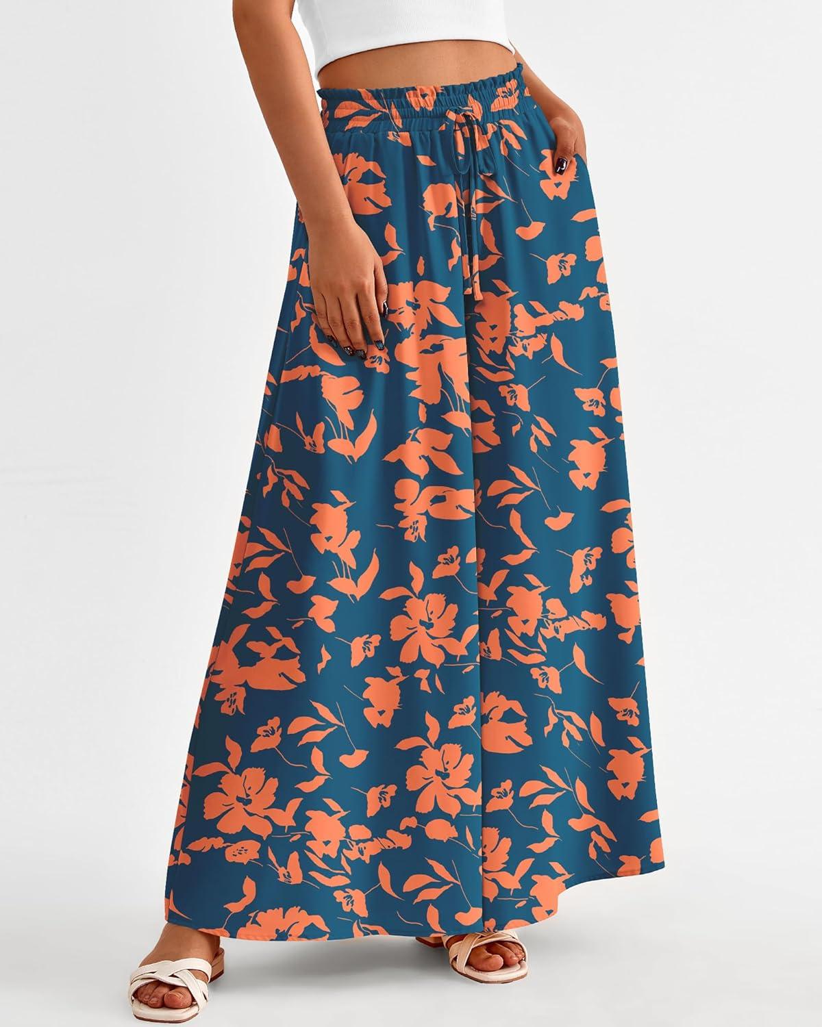 BTFBM Women Casual High Waist Wide Leg Pants 2026 Spring Summer Long Palazzo Pants Pocket Lounge Beach Vacation Clothes(Print Dark Blue Orange)