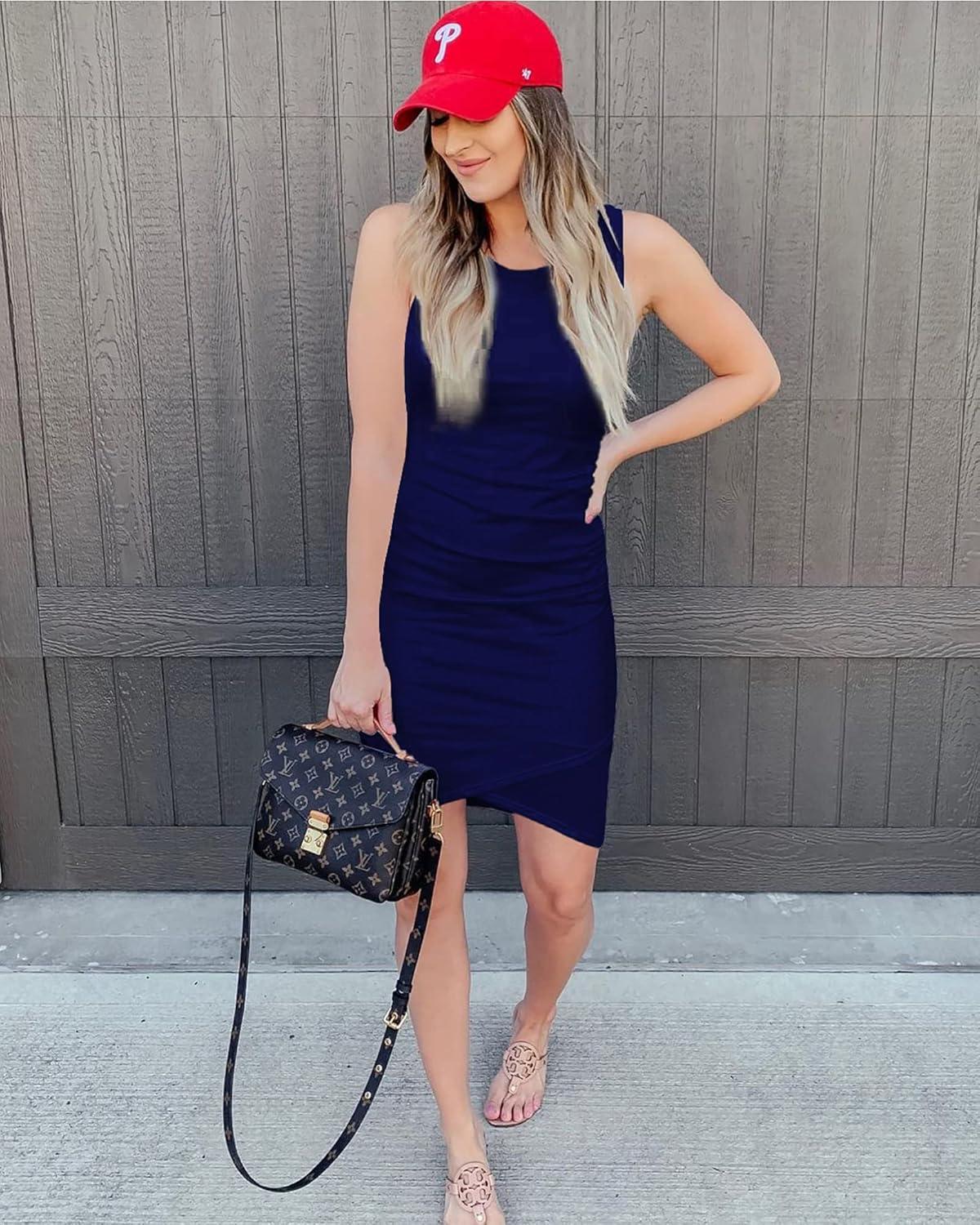 BTFBM Women Summer Dresses 2026 Sleeveless Tank Ruched Bodycon Sundresses for Women Party Beach Mini Casual Spring Dress(Navy)