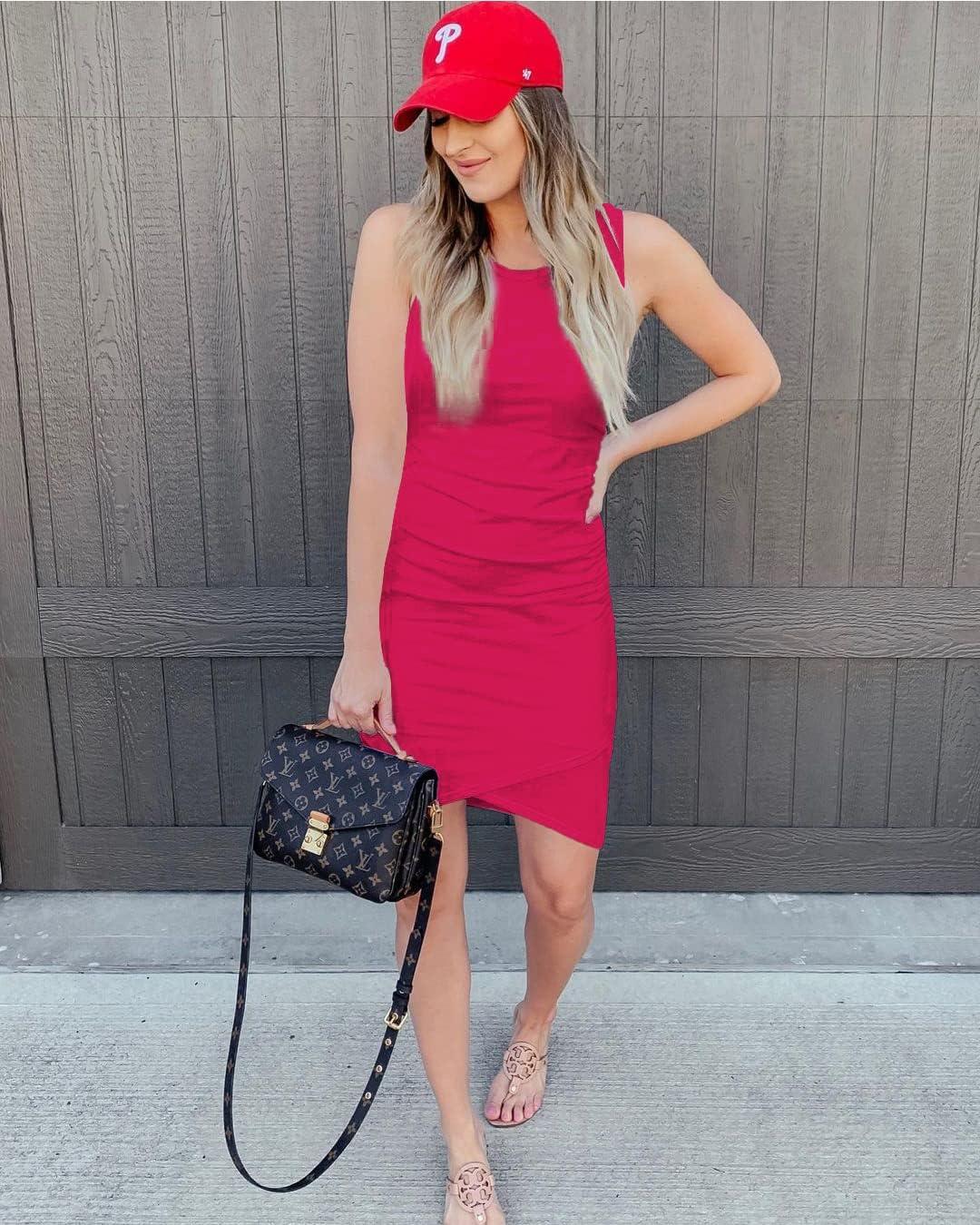 BTFBM Women Summer Dresses 2026 Sleeveless Tank Ruched Bodycon Sundresses for Women Party Beach Mini Casual Spring Dress(Rose Red)