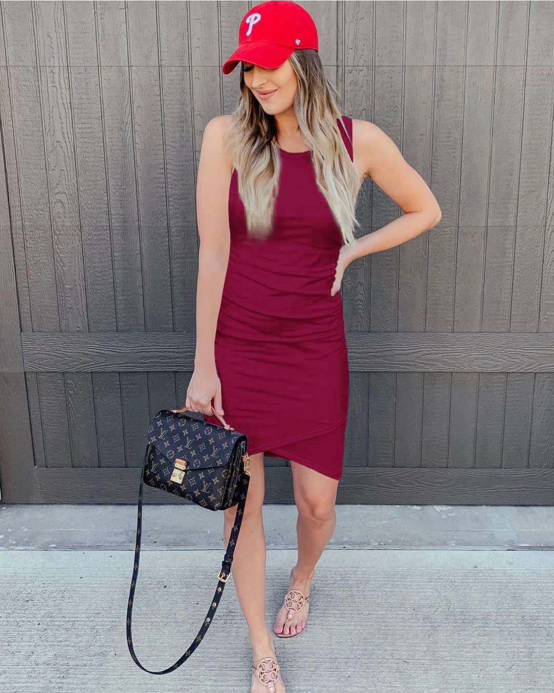 BTFBM Women Summer Dresses 2026 Sleeveless Tank Ruched Bodycon Sundresses for Women Party Beach Mini Casual Spring Dress(Wine Red)