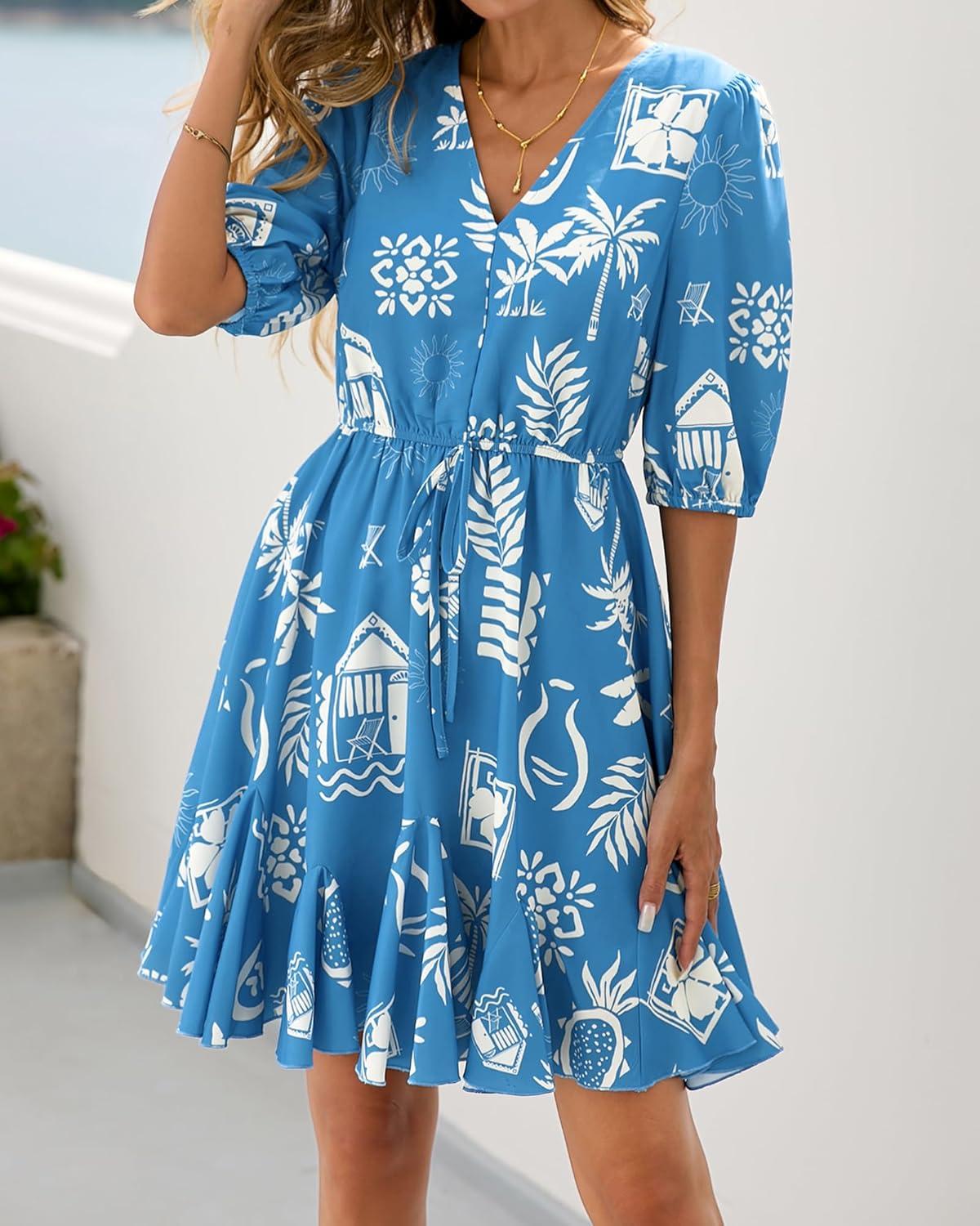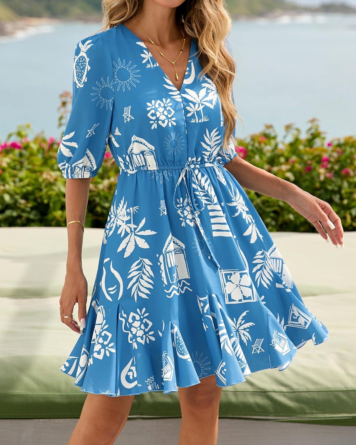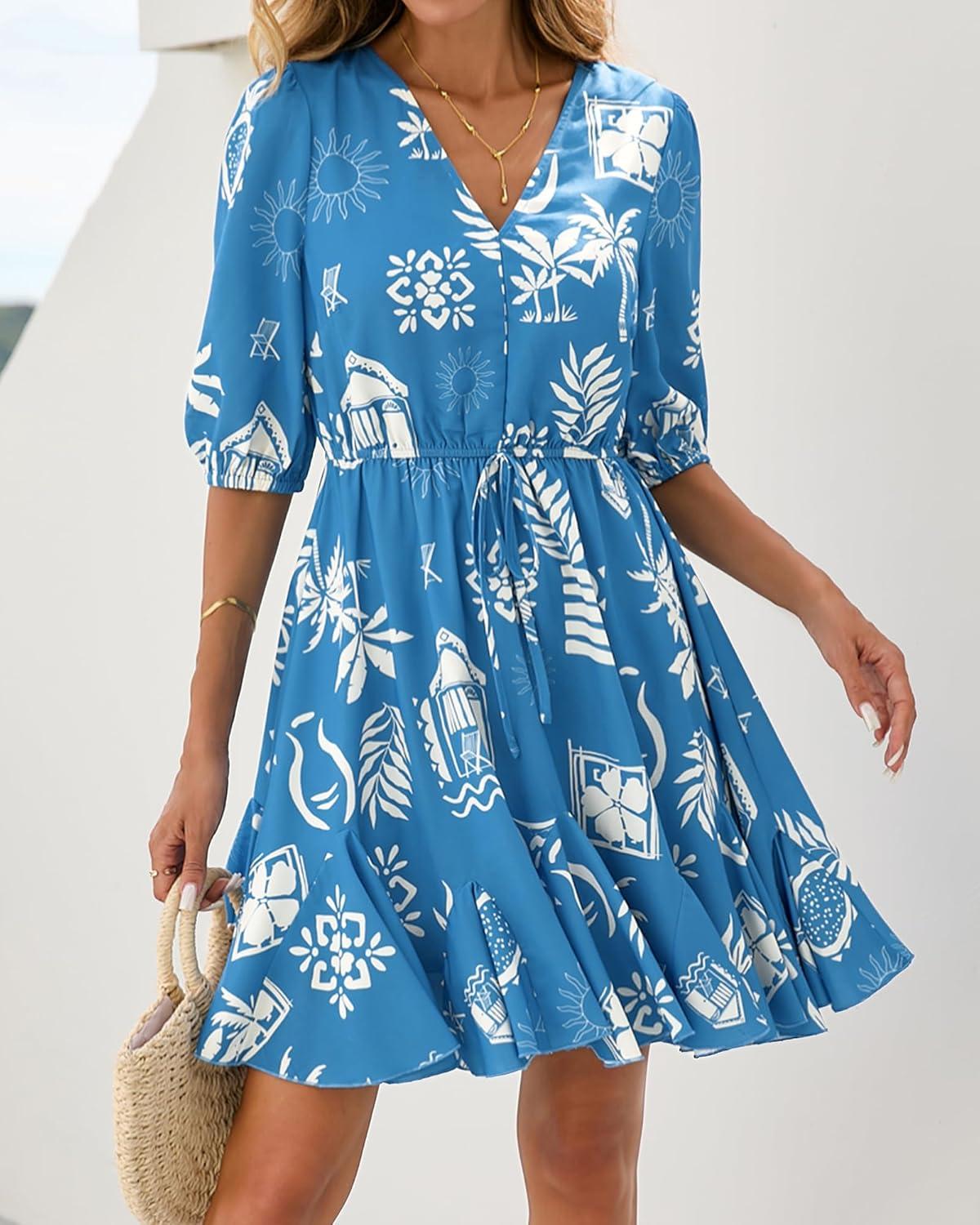 BTFBM Women Summer Spring Floral Boho Dress 2026 V Neck Short Sleeve Ruffle Beach Vacation Clothes Wedding Guest Dresses(Floral Blue White)