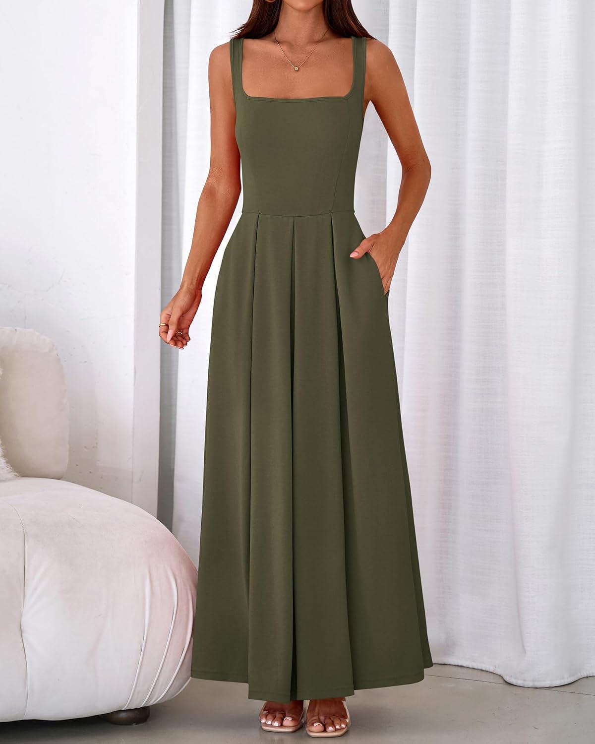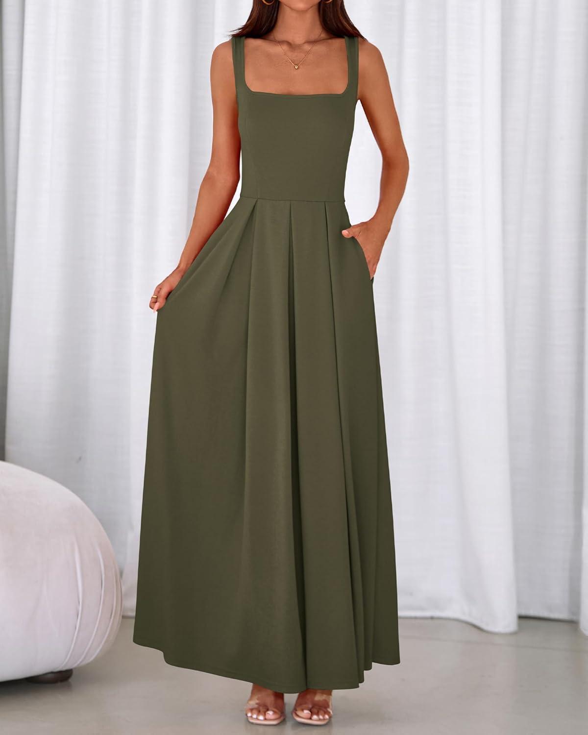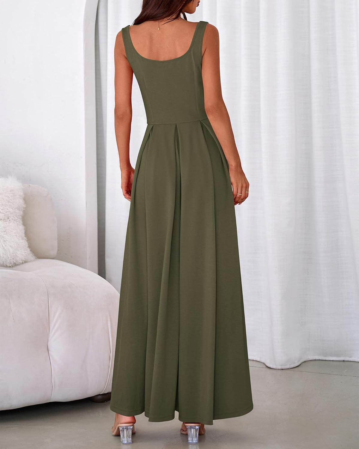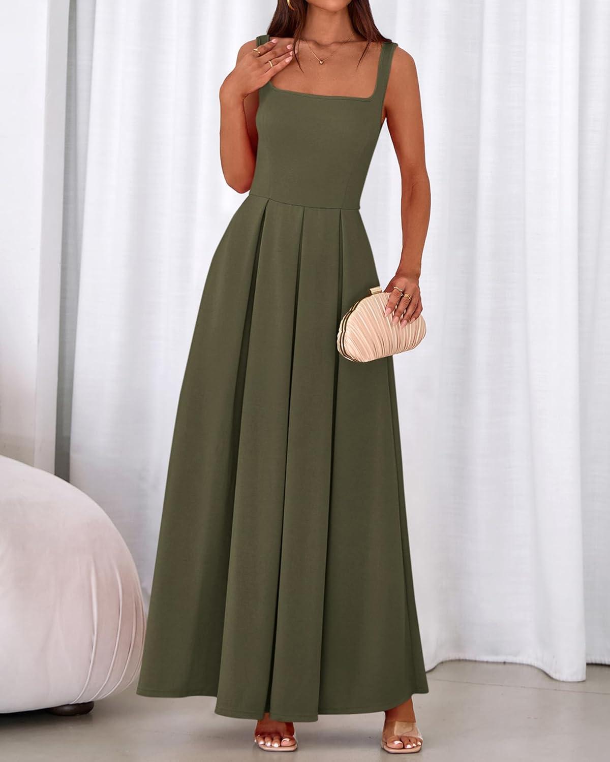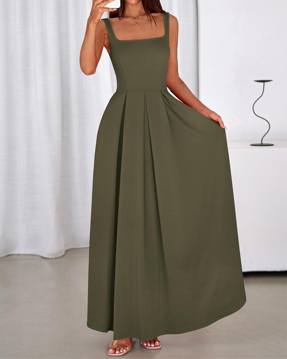 BTFBM Women Summer Square Neck Maxi Dress Spring 2026 Elegant Classy Sleeveless Formal Wedding Guest Cocktail Dresses(Army Green)