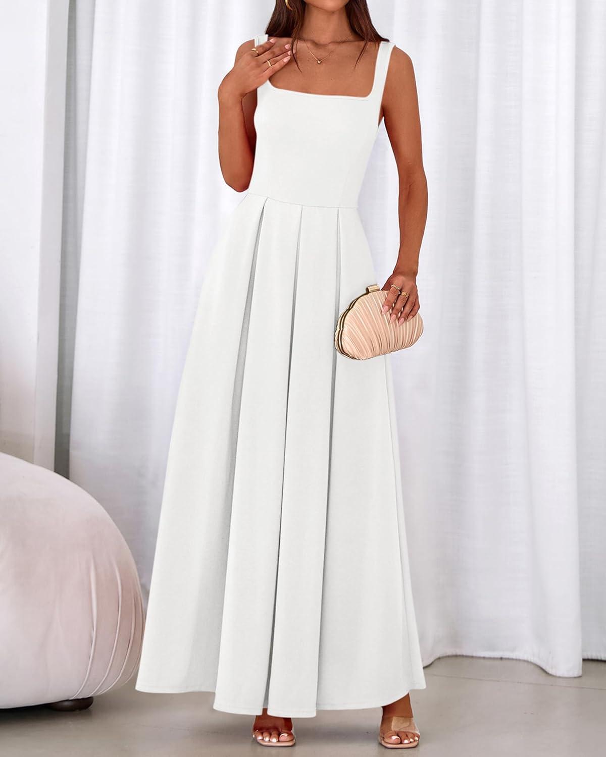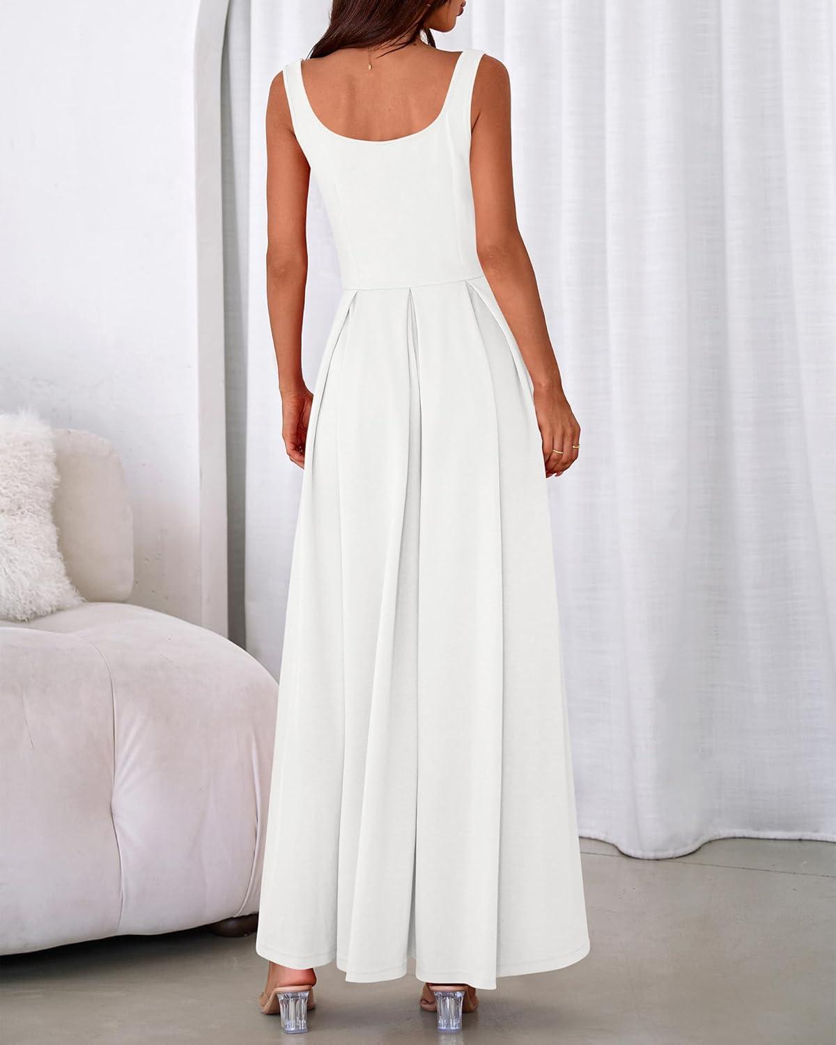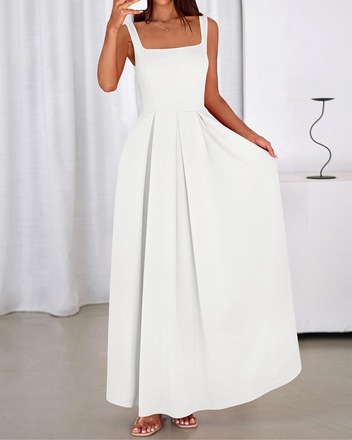 BTFBM Women Summer Square Neck Maxi Dress Spring 2026 Elegant Classy Sleeveless Formal Wedding Guest Cocktail Dresses(White)