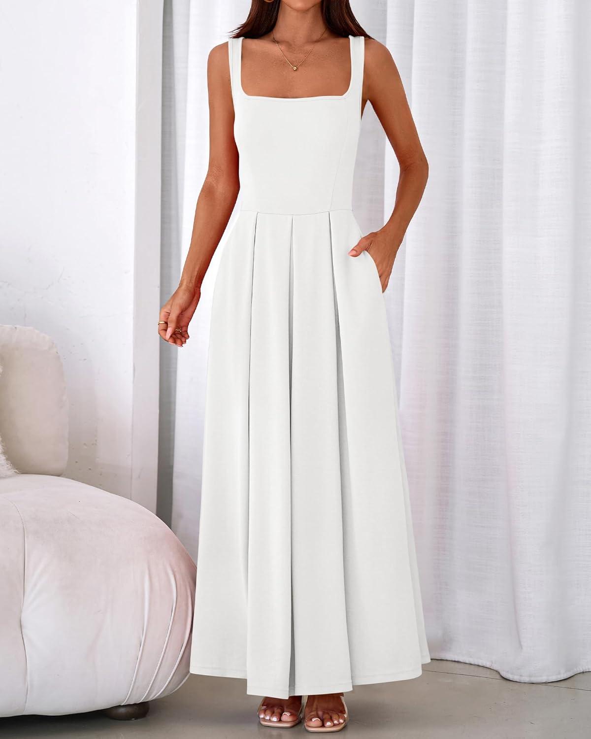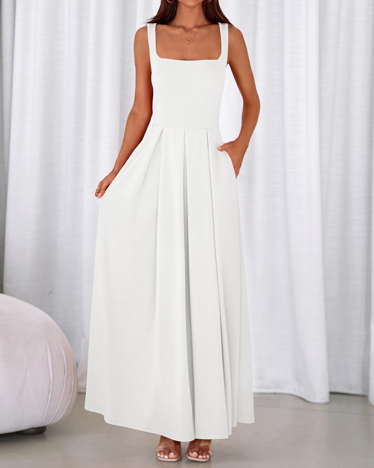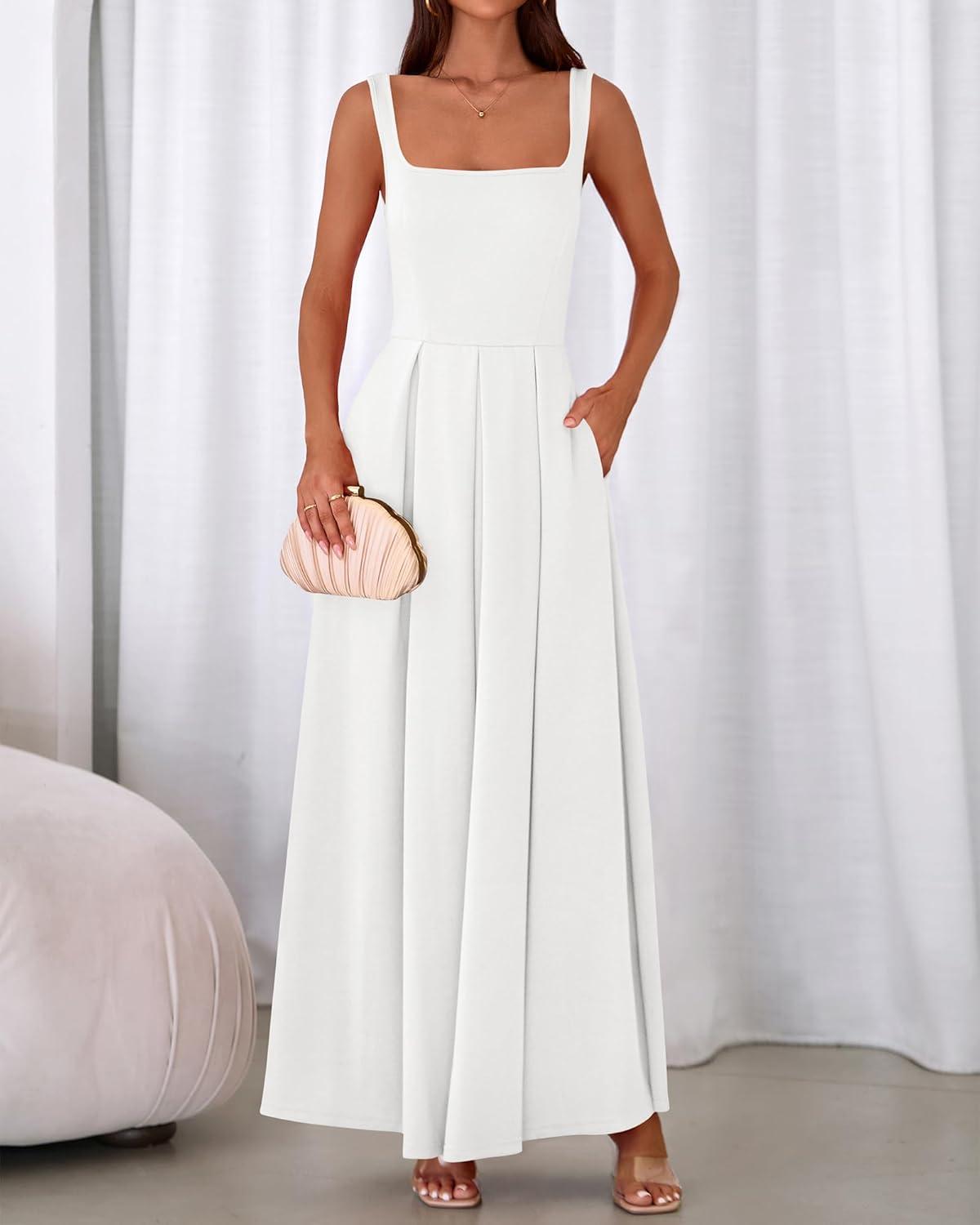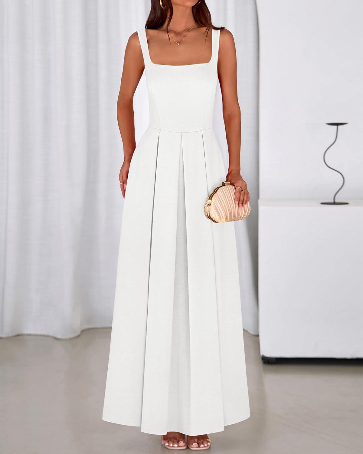 BTFBM Women Summer Square Neck Maxi Dress Spring 2026 Elegant Classy Sleeveless Formal Wedding Guest Cocktail Dresses(White)