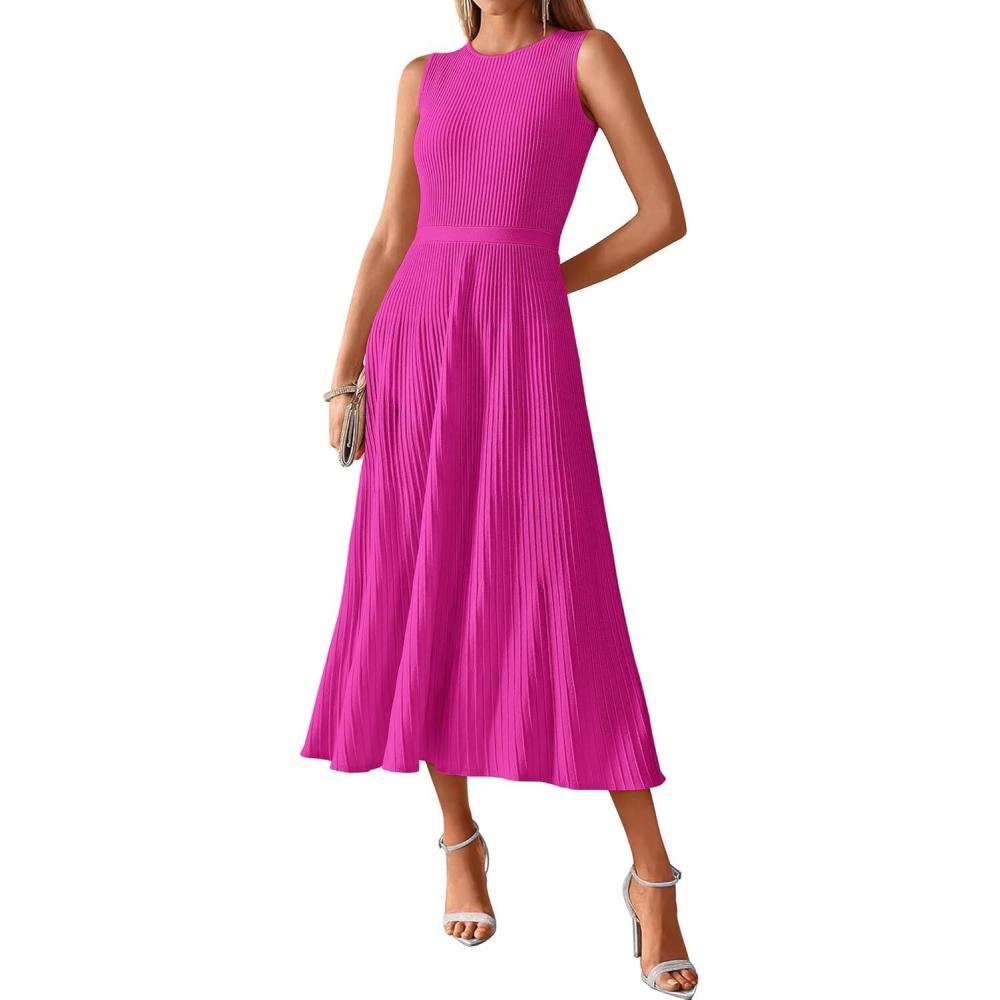 BTFBM Women Tank Midi Dress Summer Crewneck Sleeveless Pleated A Line Business Casual Formal Sweater Spring Dresses 2026(Rose Red)