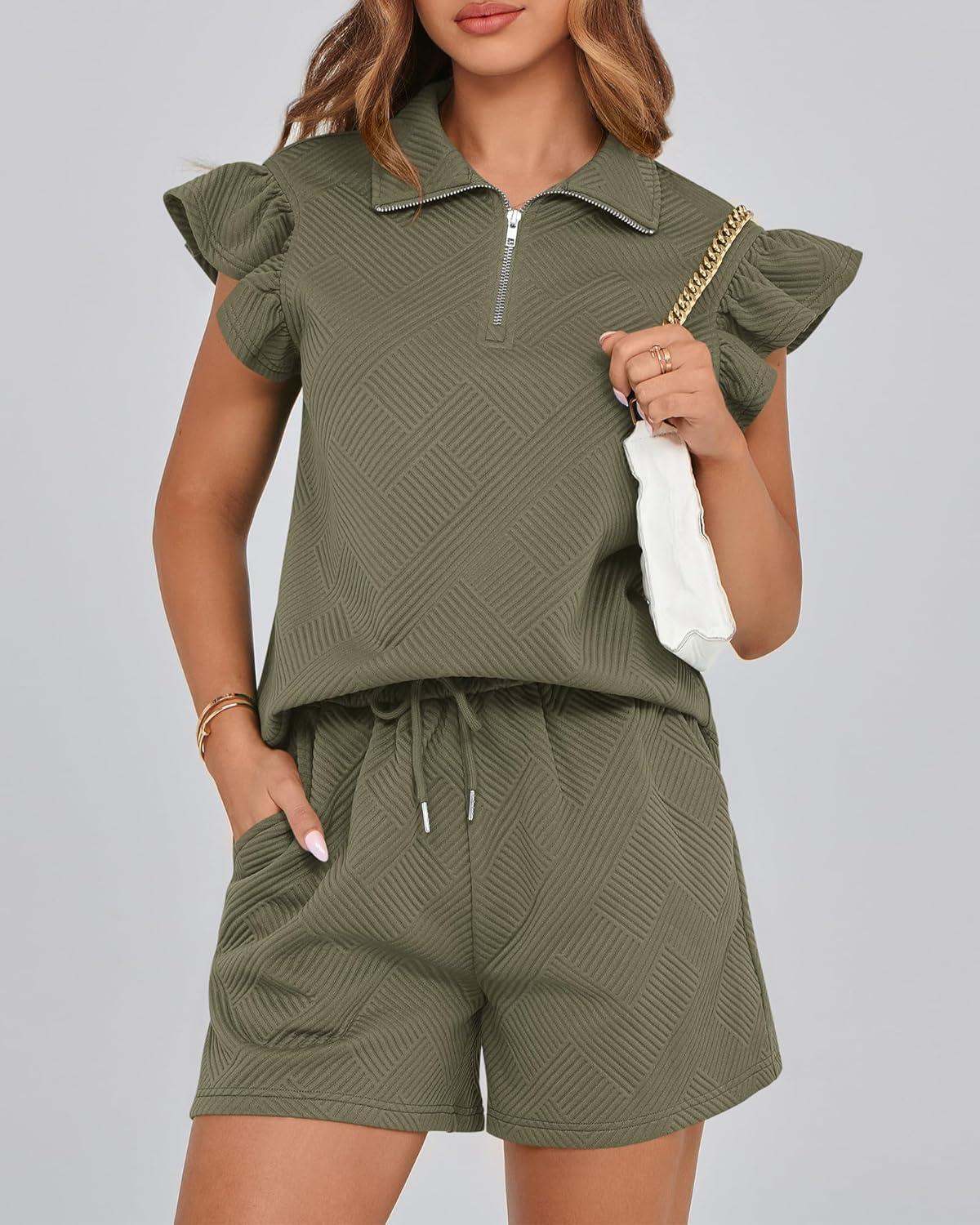 BTFBM Womens 2 Piece Outfits Spring Sweatsuit Zipper V Neck Casual Ruffle Cap Sleeve Tops Drawstring Shorts Lounge Sets(Army Green)