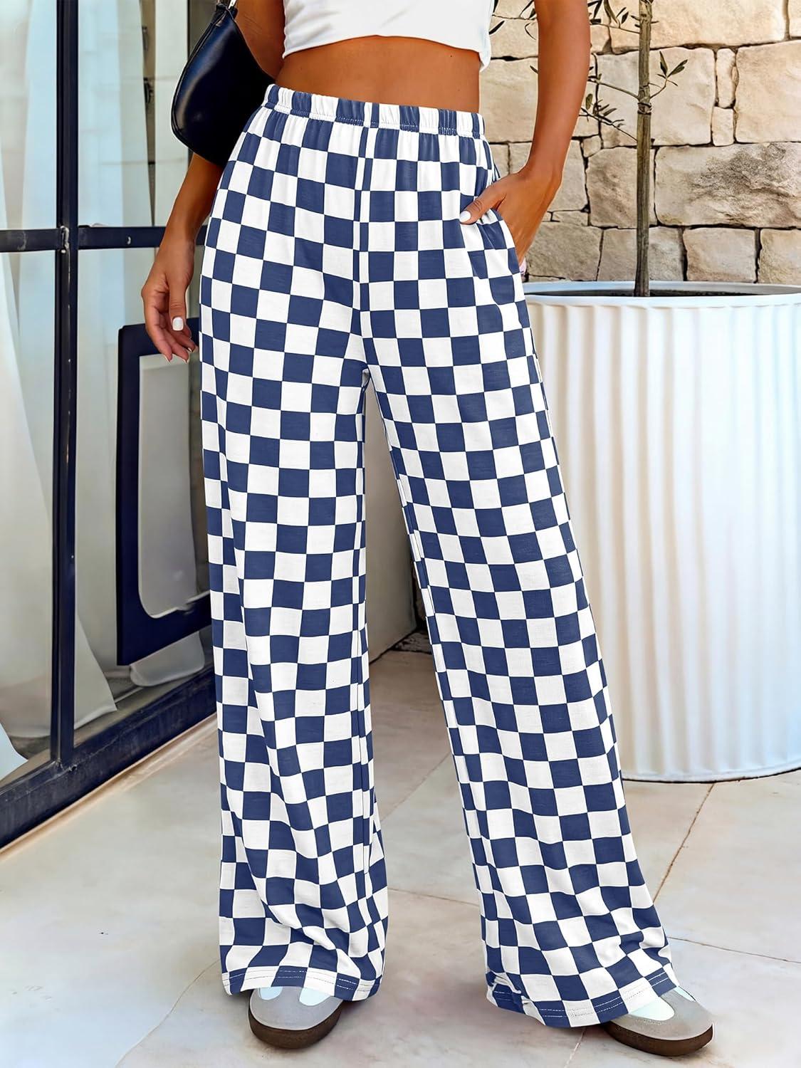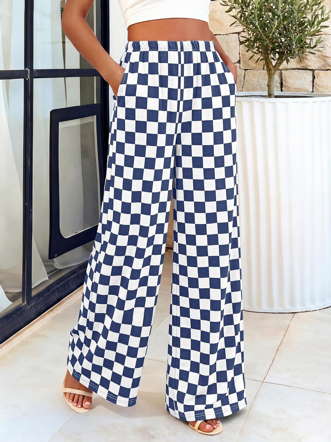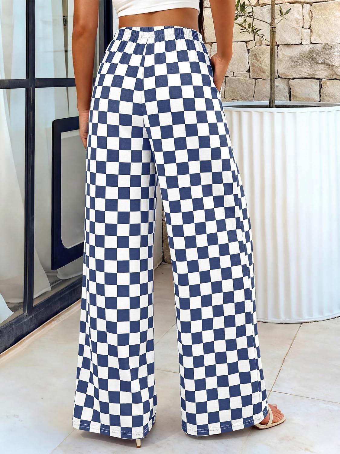 BTFBM Womens Checkered Palazzo Pants Wide Leg High Waisted Pockets Gingham Casual Lounge Pajama Trousers Summer Outfits(Plaid Grey Blue)