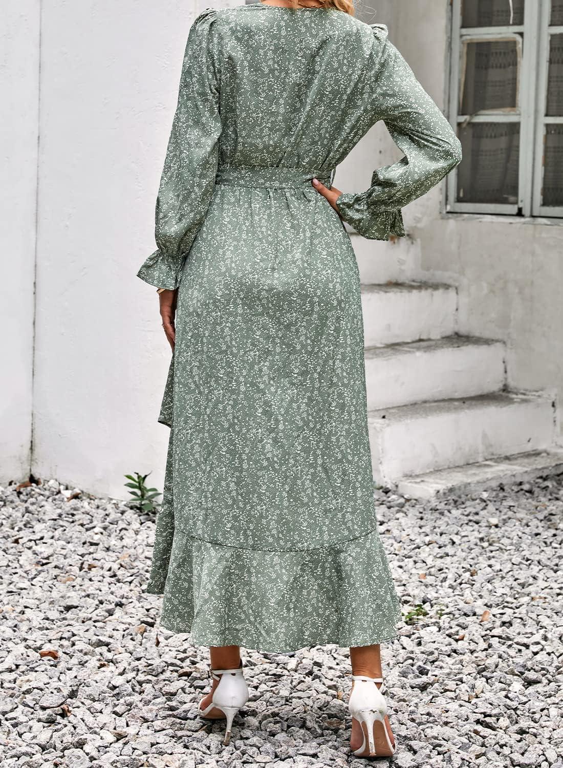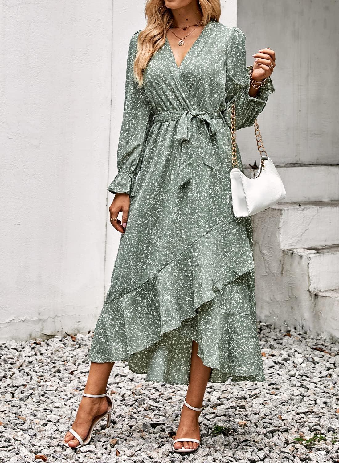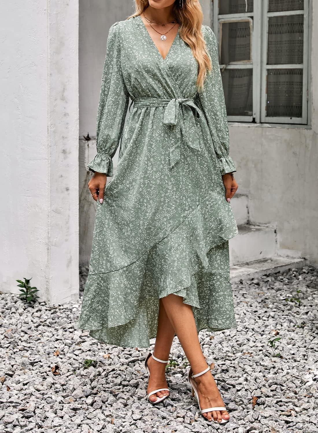 BTFBM Womens Dresses Spring Clothes 2026 V Neck Floral High Waist Ruffle Wedding Guest Cocktail Boho Long Sleeve Dress(Floral Green)