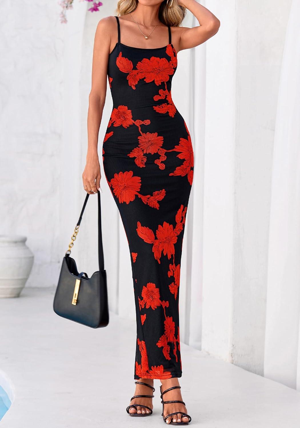BTFBM Womens Maxi Dress 2026 Spring Floral Sexy Spaghetti Straps Sleeveless Bodycon Summer Beach Wedding Guest Dresses(Floral Black Red)
