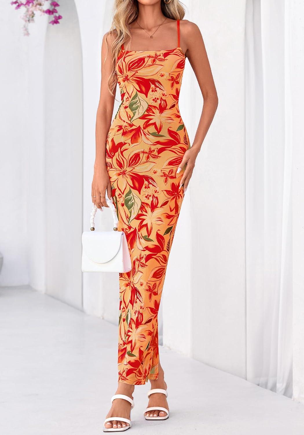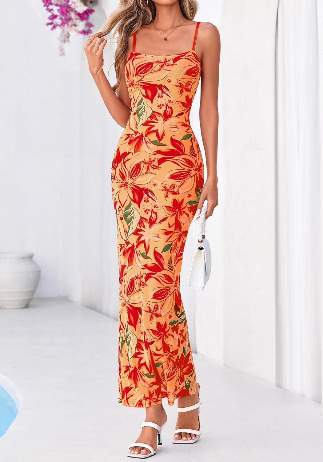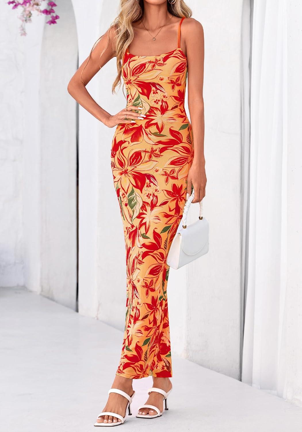 BTFBM Womens Maxi Dress 2026 Spring Floral Sexy Spaghetti Straps Sleeveless Bodycon Summer Beach Wedding Guest Dresses(Floral Yellow Red)