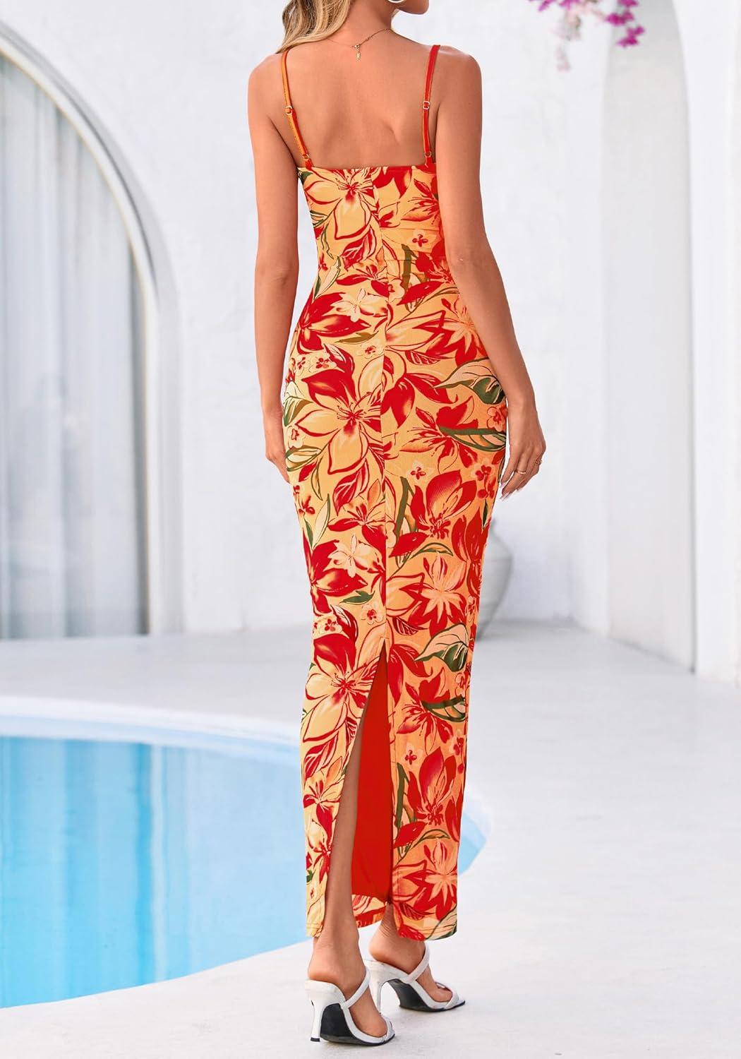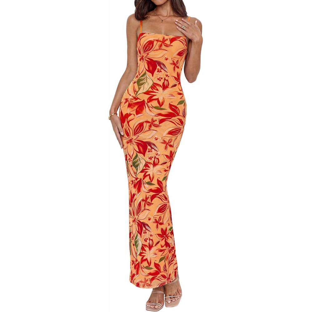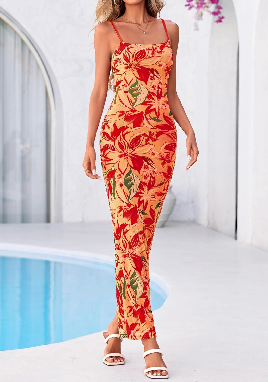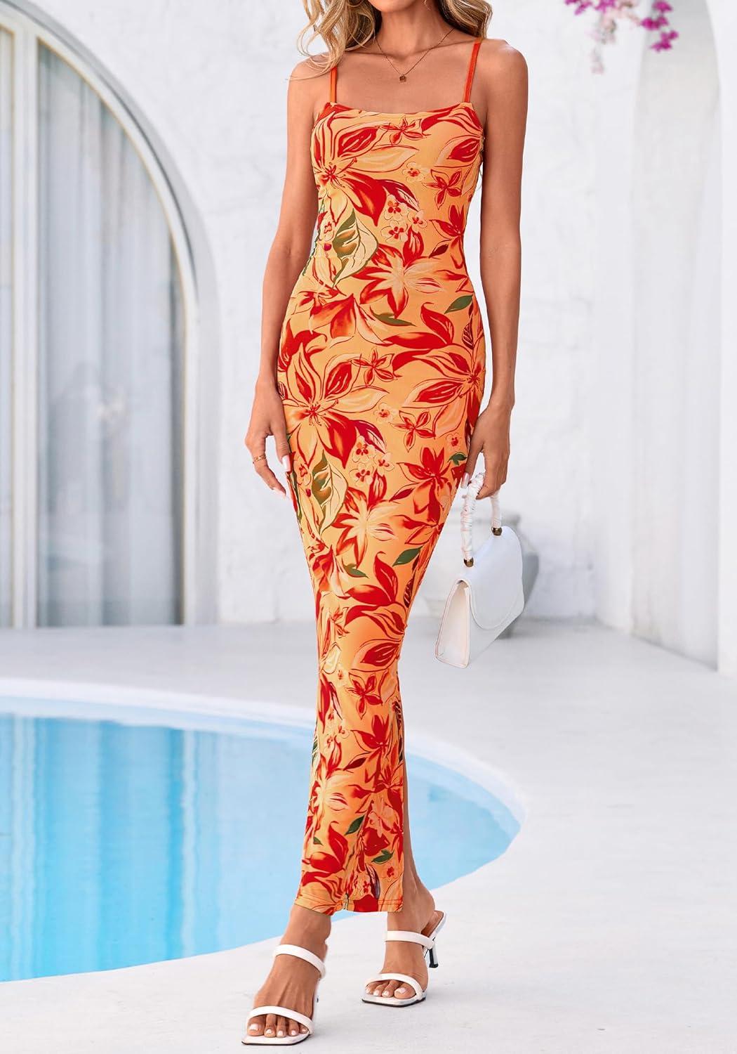 BTFBM Womens Maxi Dress 2026 Spring Floral Sexy Spaghetti Straps Sleeveless Bodycon Summer Beach Wedding Guest Dresses(Floral Yellow Red)