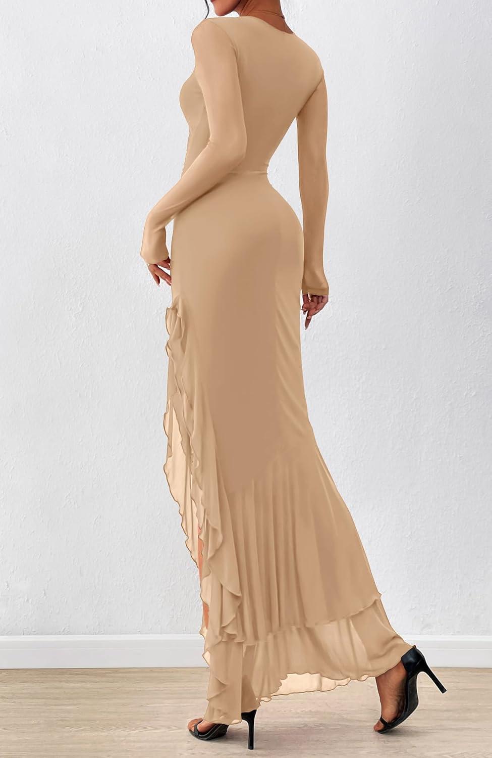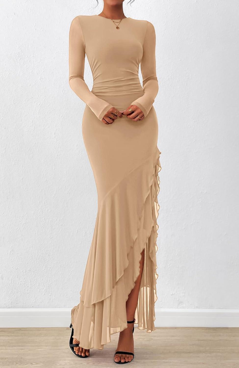 BTFBM Women’s Maxi Dresses Fall 2025 Long Sleeve Ruched Bodycon Solid Ruffle Mermaid Cocktail Wedding Guest Dress(Khaki)