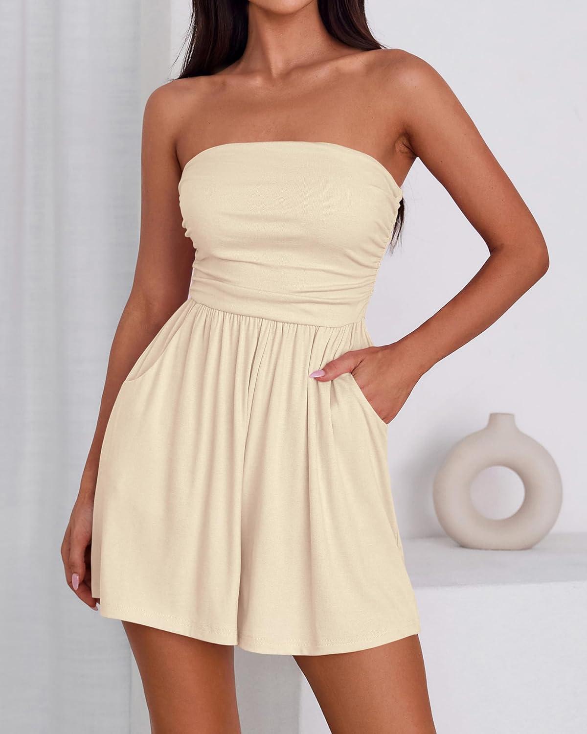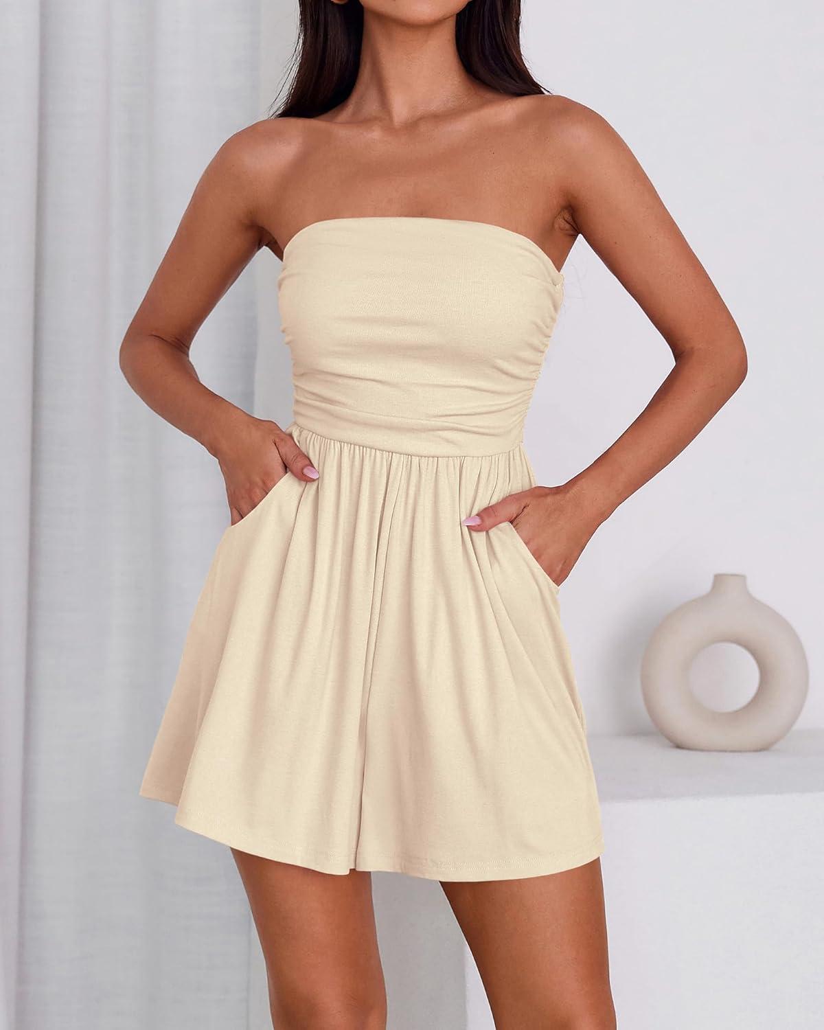 BTFBM Womens Romper 2026 Spring Summer Strapless Tube Tops Beach Vacation Clothes Boho Loose Shorts Jumpsuits Pockets(Apricot Khaki)