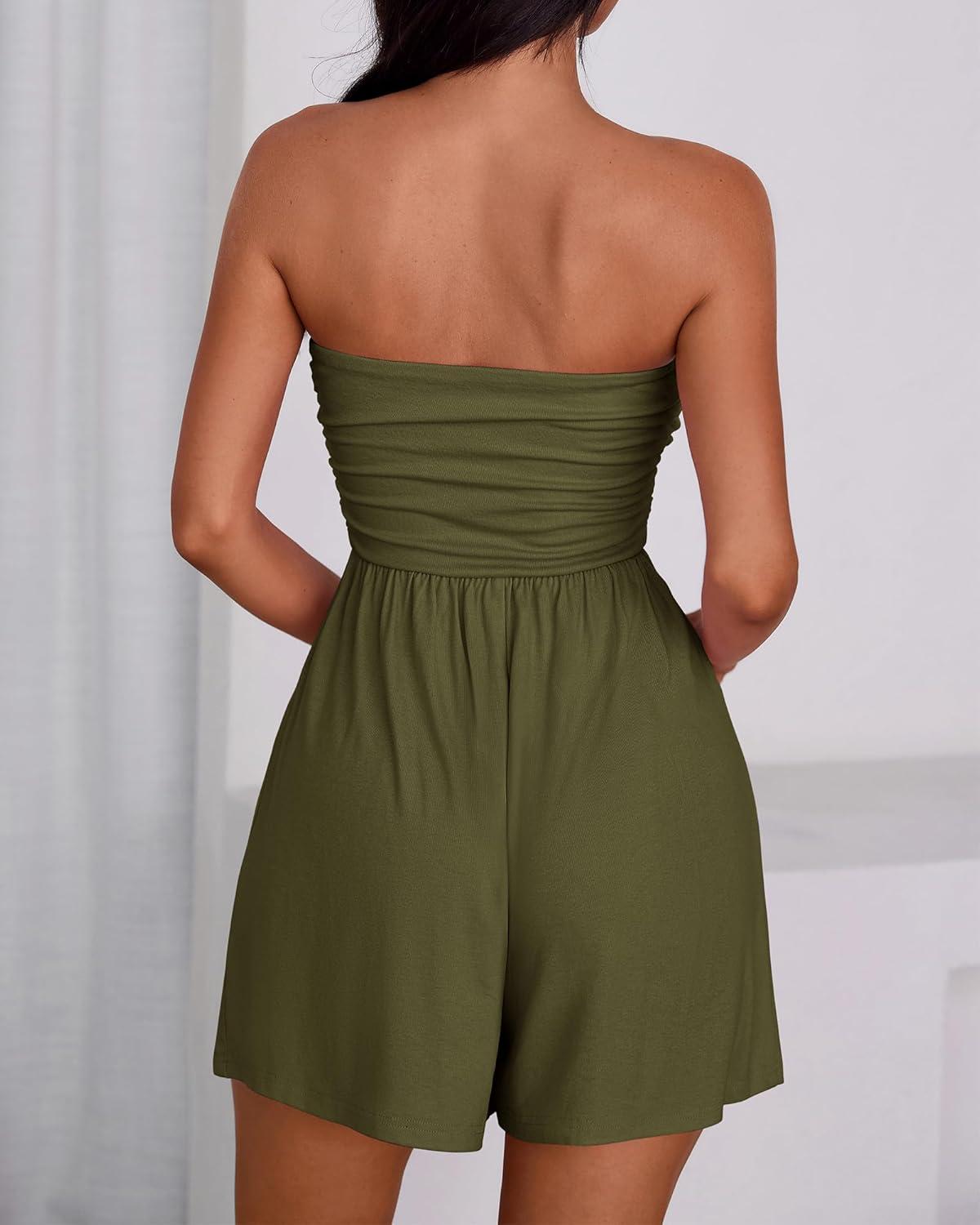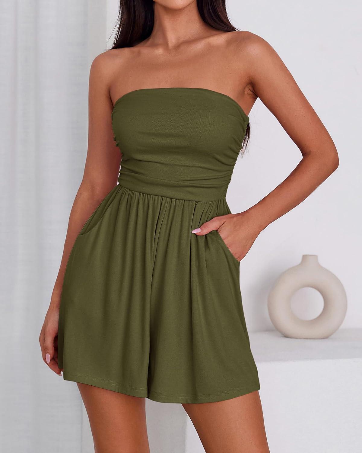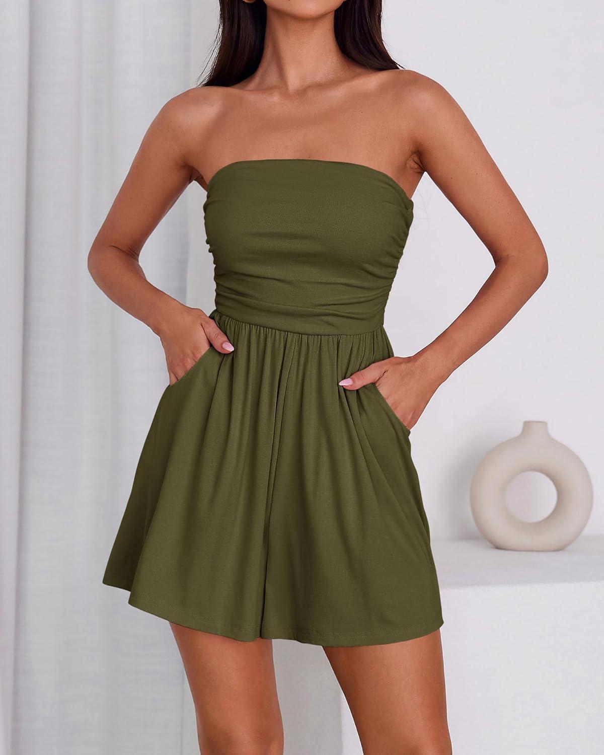 BTFBM Womens Romper 2026 Spring Summer Strapless Tube Tops Beach Vacation Clothes Boho Loose Shorts Jumpsuits Pockets(Army Green)