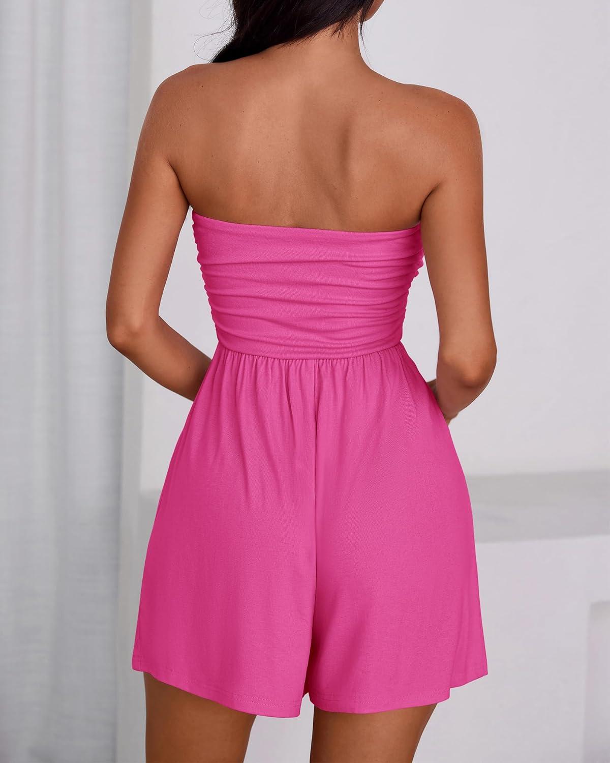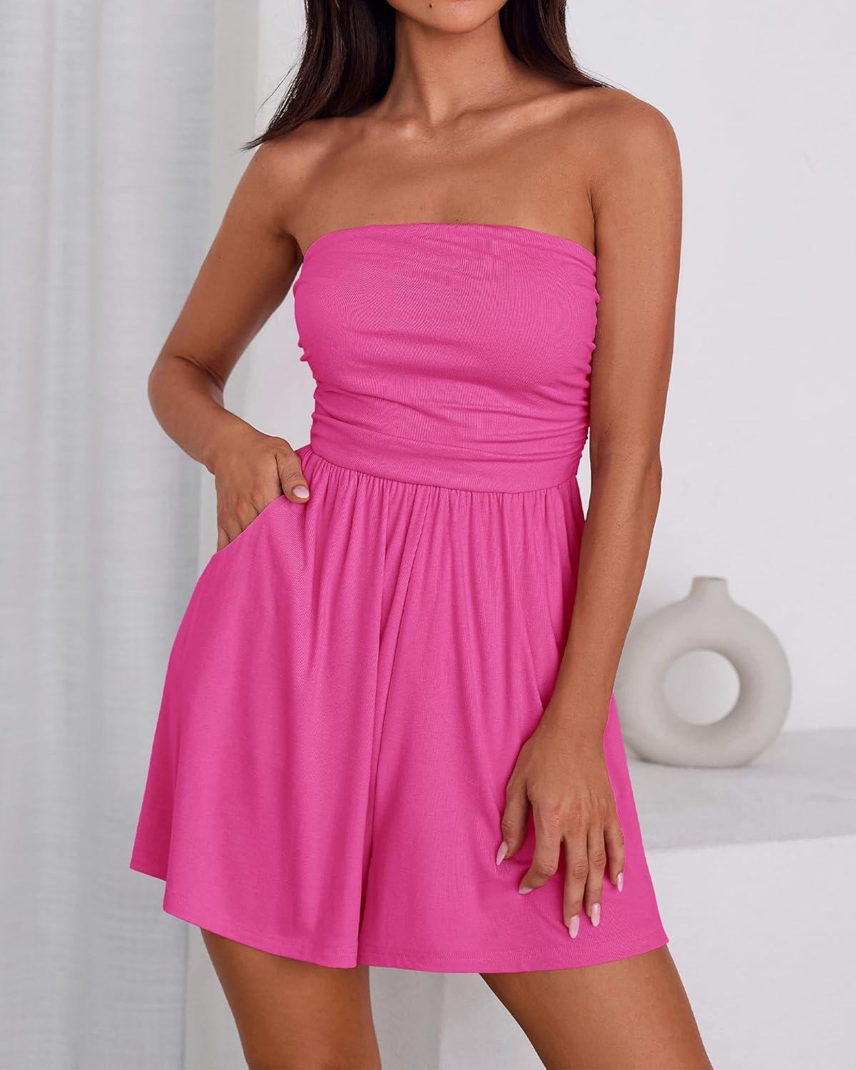 BTFBM Womens Romper 2026 Spring Summer Strapless Tube Tops Beach Vacation Clothes Boho Loose Shorts Jumpsuits Pockets(Rose Red)