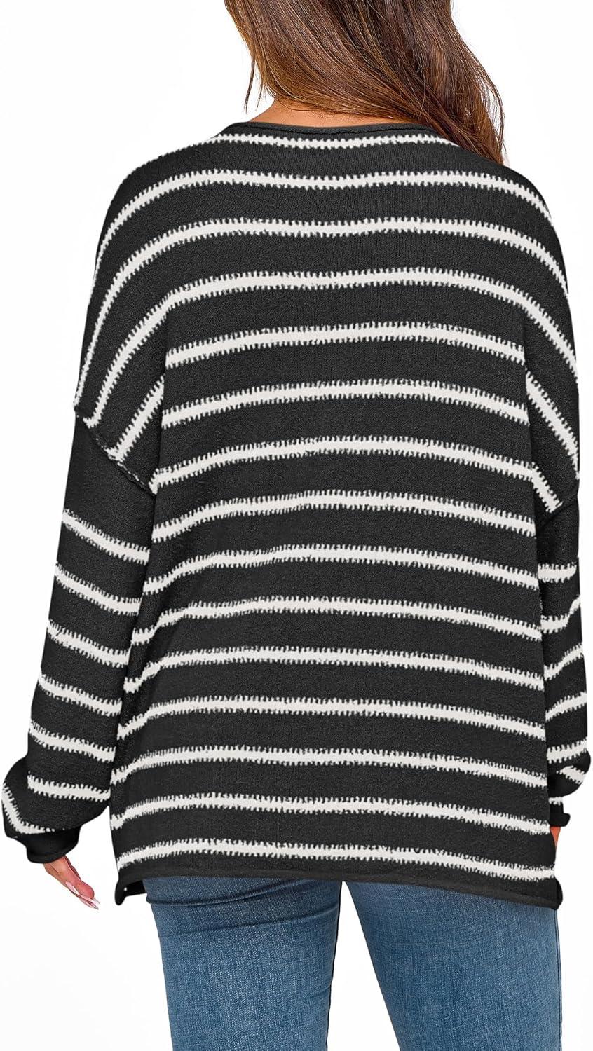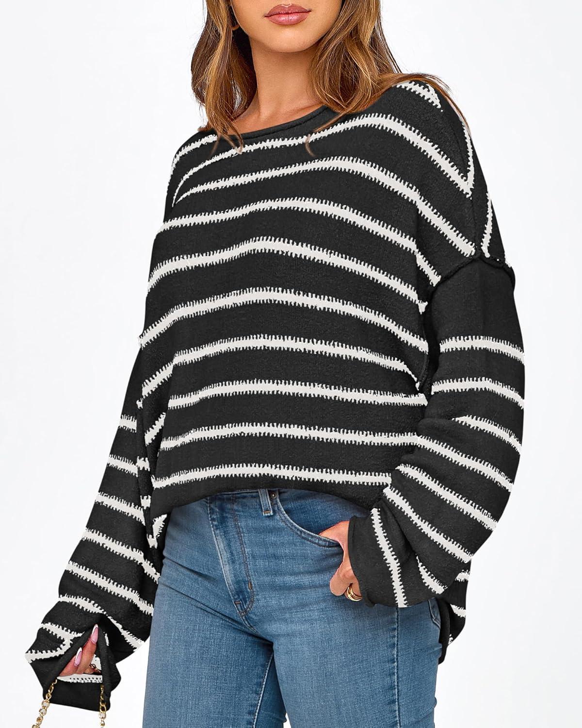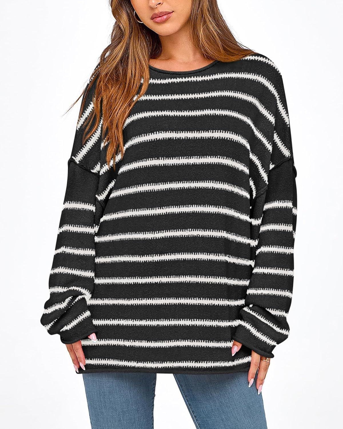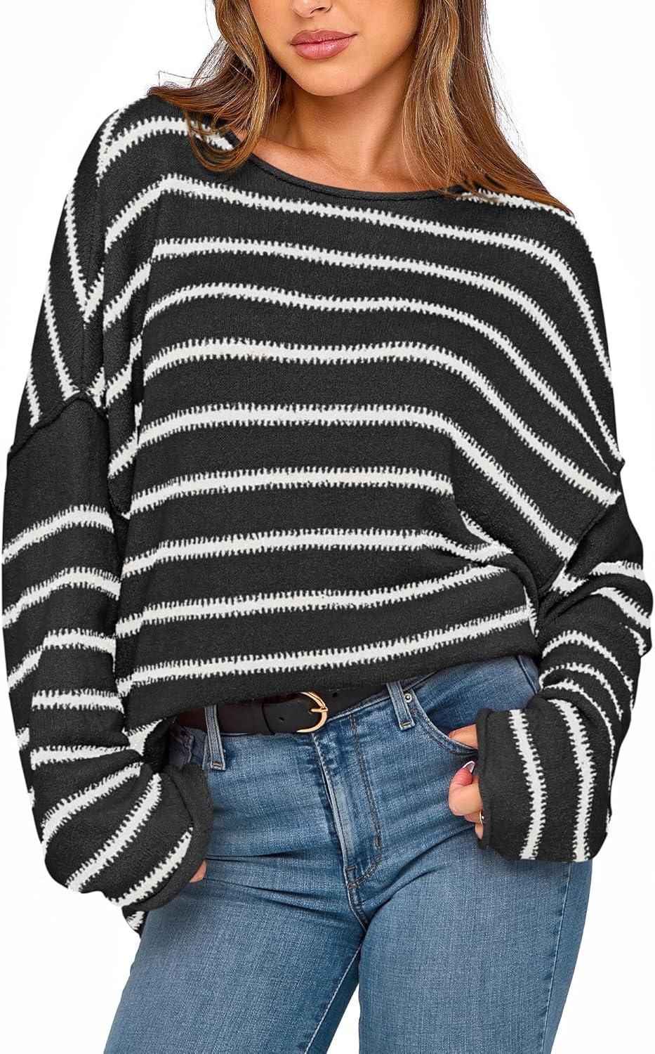 BTFBM Women’s Striped Knit Sweaters 2026 Spring Fall Boat Neck Off Shoulder Long Sleeve Oversized Casual Pullover Tops(Striped Black White)