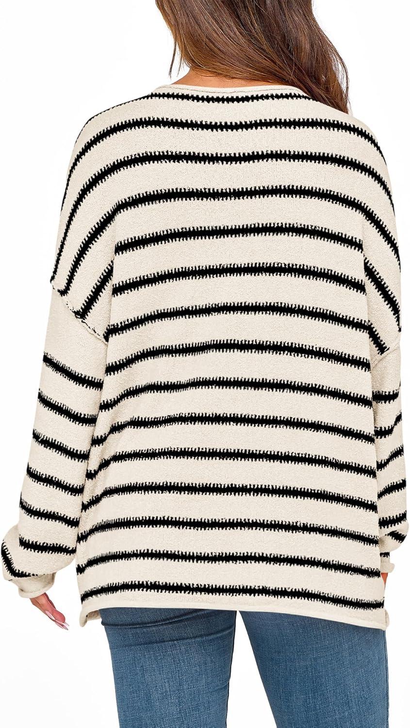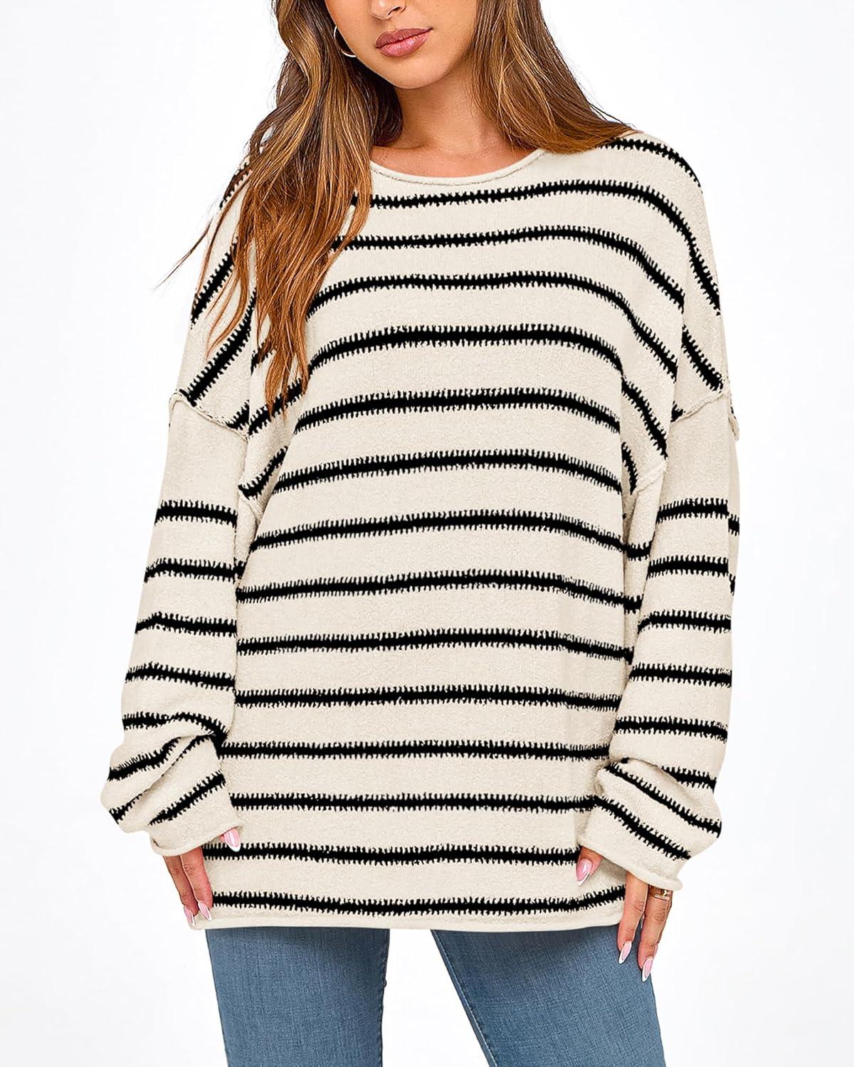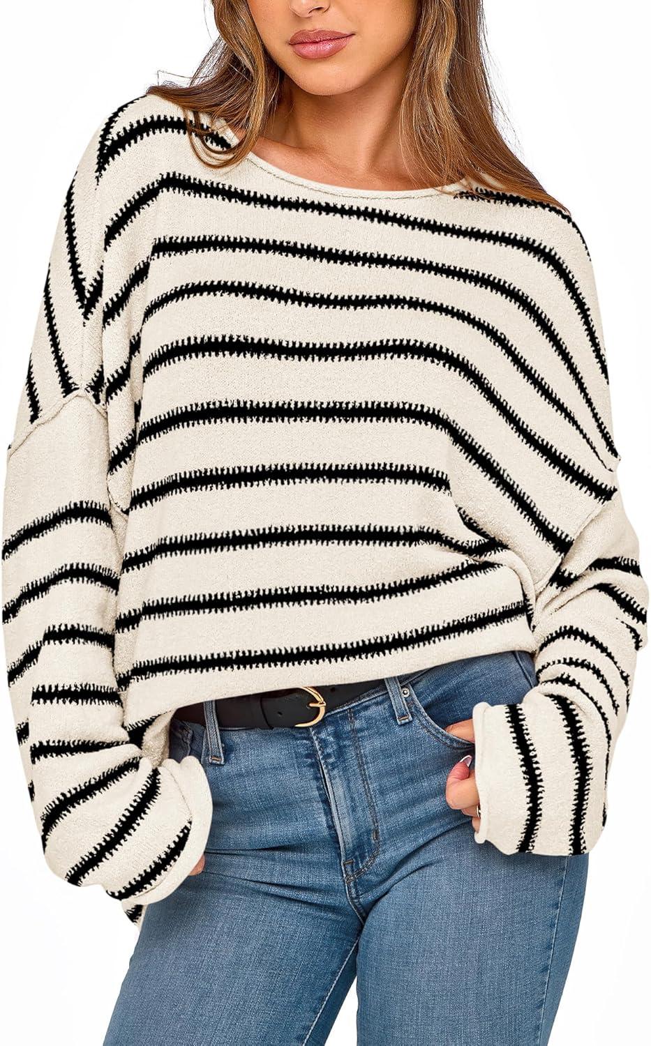 BTFBM Women’s Striped Knit Sweaters 2026 Spring Fall Boat Neck Off Shoulder Long Sleeve Oversized Casual Pullover Tops(Striped White Black)