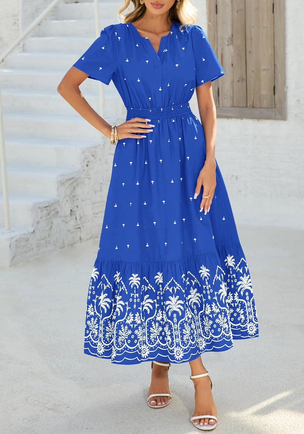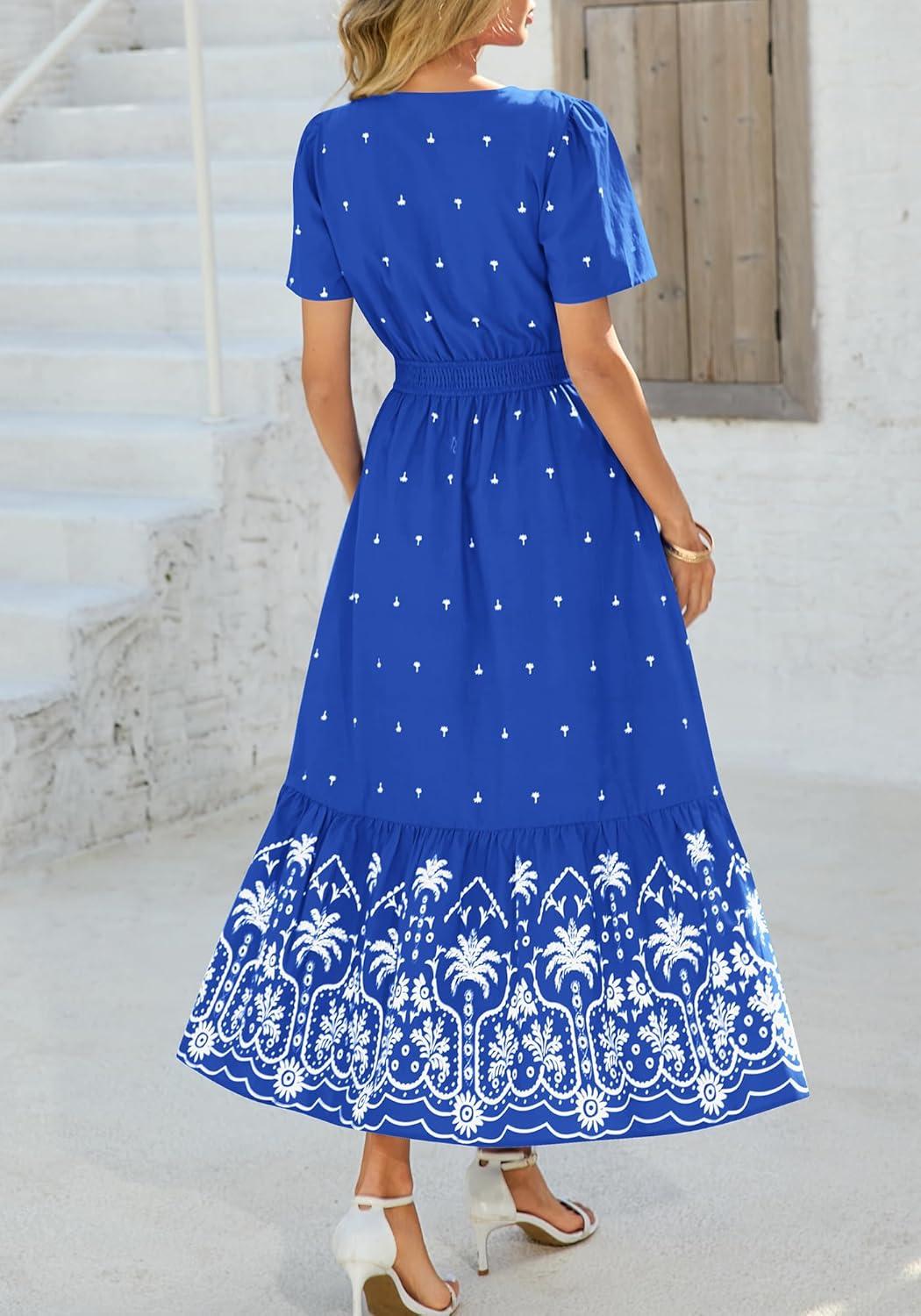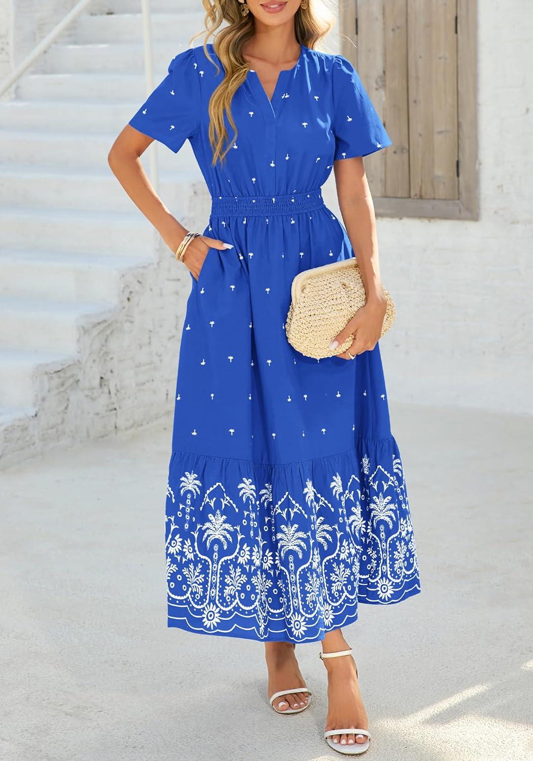 BTFBM Womens Summer Dresses 2026 Casual Short Sleeve Elastic Waist Flowy Beach Vacation Floral Boho Maxi Dress Pockets(Royal Blue White Flower)