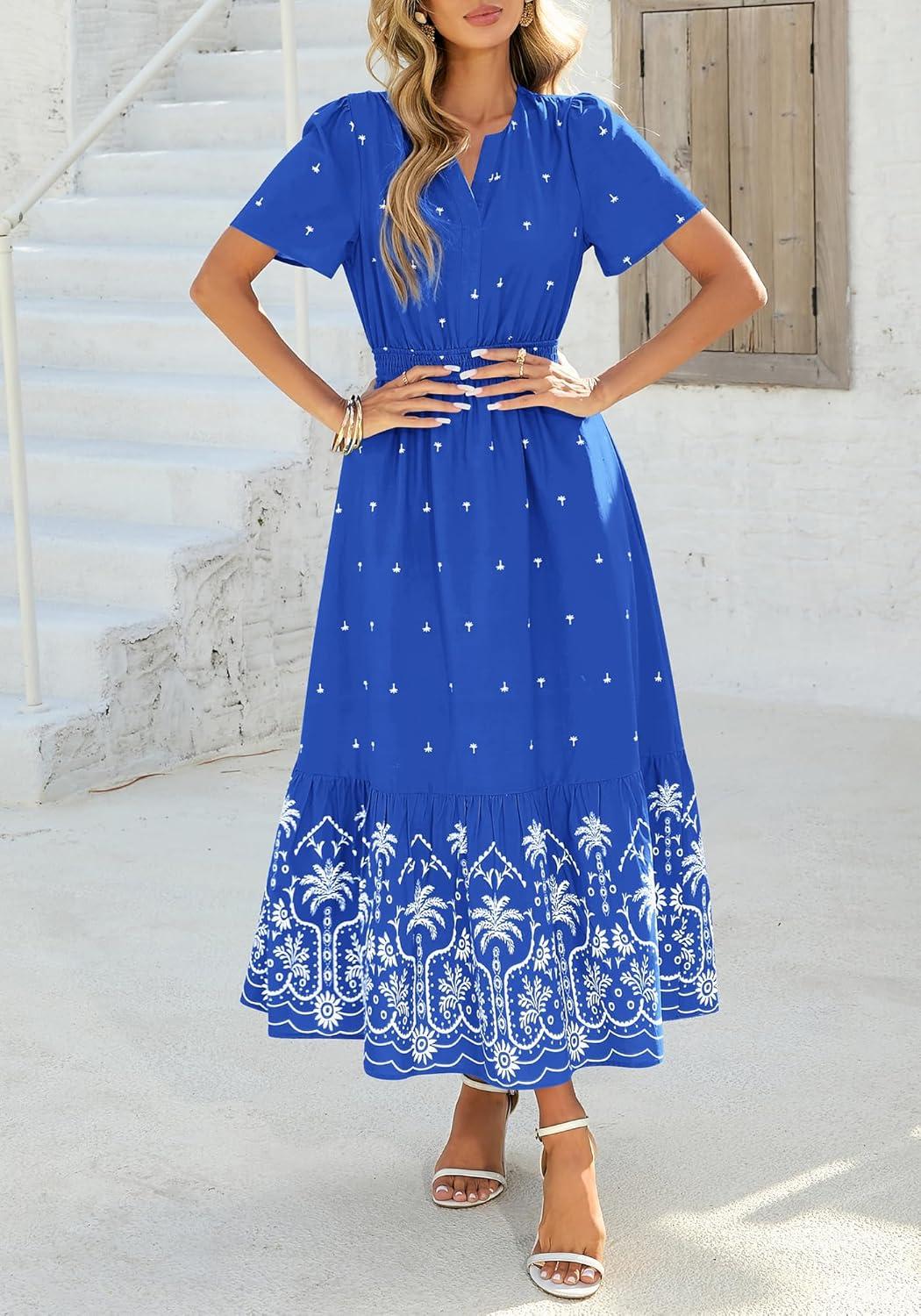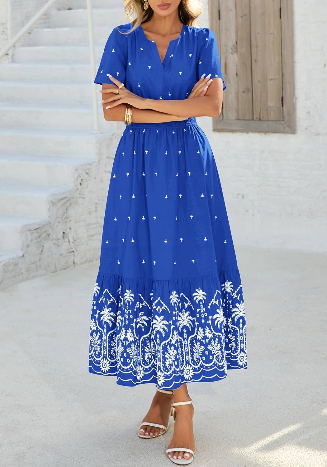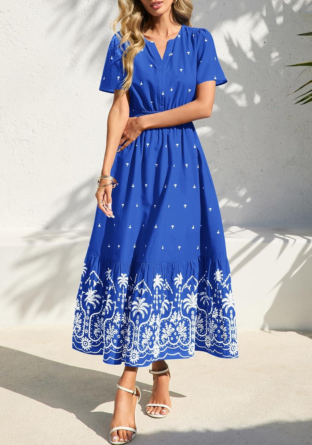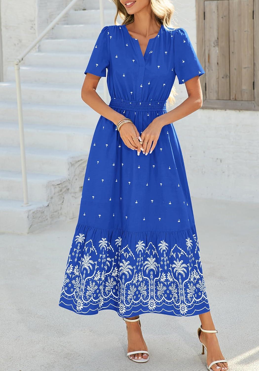 BTFBM Womens Summer Dresses 2026 Casual Short Sleeve Elastic Waist Flowy Beach Vacation Floral Boho Maxi Dress Pockets(Royal Blue White Flower)